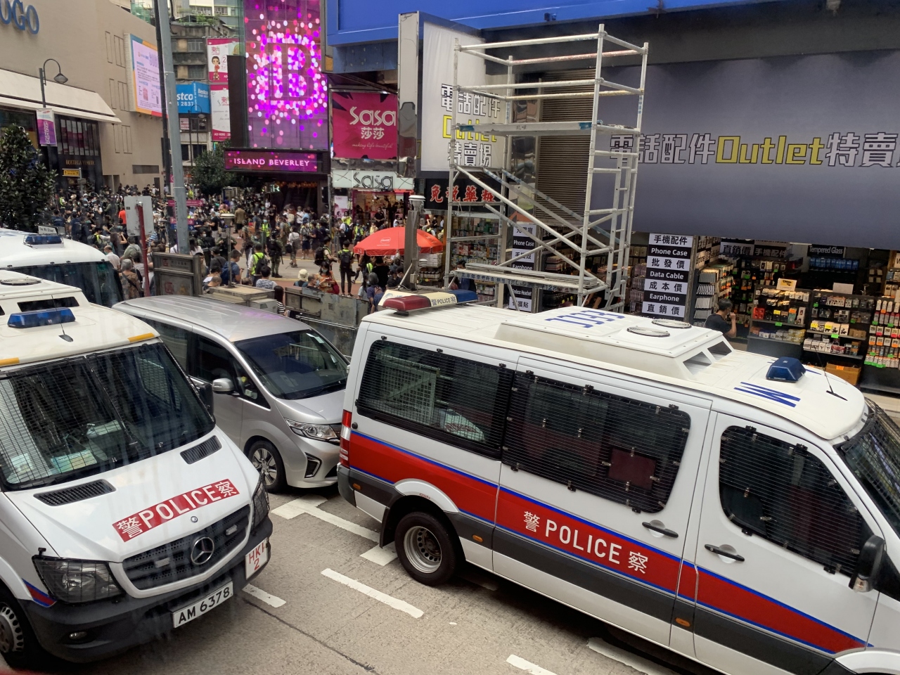 コロナ禍の香港ではあまり外出に制限はありません。今日もコーズウエイベイのそごうの前の交差点はこんな感じです。警察の車がでているのは今日は中国の国慶節で祝日でなにか不穏な動きがないかどうかを監視しています