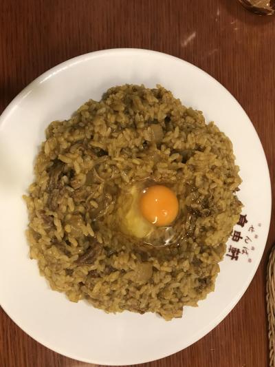最初は父親に小さいときに連れてきてもらいました。1年に1度は食べに来ます。カレーと白ご飯が既に混ぜ合わせてあり、生卵が真ん中に乗っています。大阪人はカレーには必ずウスターソースをかけます。みなさん玉子の周りを一周ですが、私は二周します