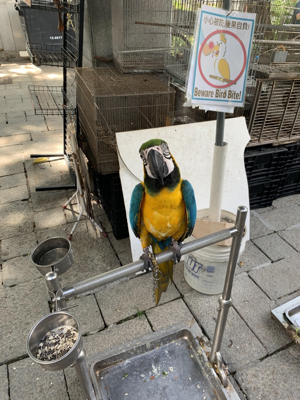 旺角東駅の一番北の出口からでて、道路を渡るとフラワーマーケットがあり、その右上にバードマーケットがあります。昔からは少し移転しました。さまざまな鳥を売っていますが、鳴き声のよいものが高いです。餌のバッタなども販売しているので注意してください
