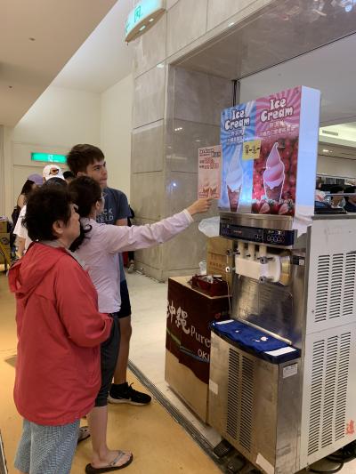 今日はいろいろなものを食べたのでバスを使わずいろんなところを歩いています。新光三越があったのでなかで涼みます。沖縄物産展をやっていてアイスクリームを買いました。いろんなものを販売していて楽しかったです