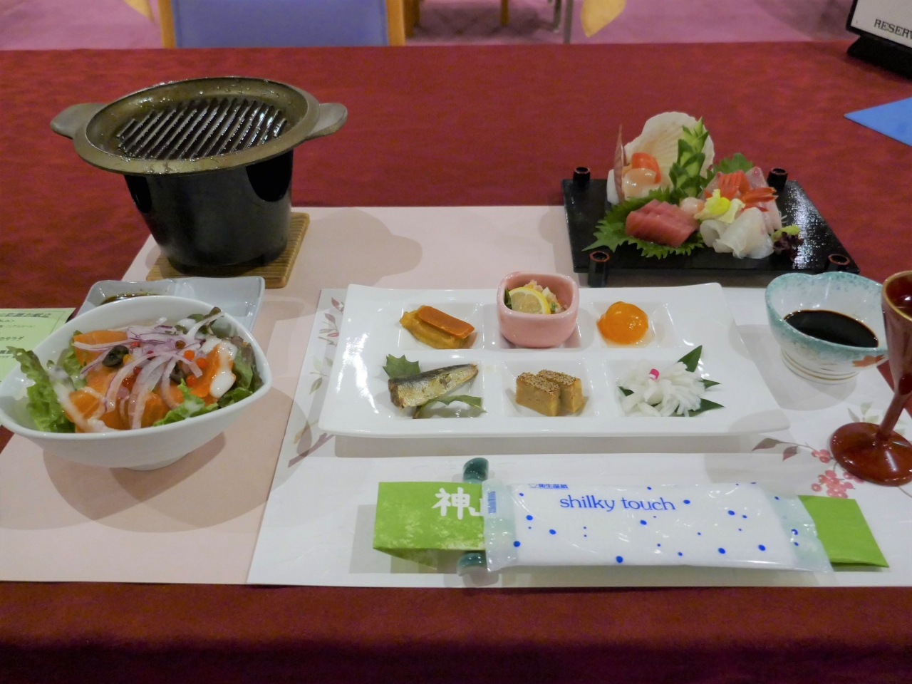 1泊2食で19360円と少し高め.温泉棟は別にあり,地元の人が入りに来るがそれほど混雑していない.温泉もいいし,サウナ三昧 夕食は神山の恵み特別山彩膳というコースでまあまあ.朝食も具だくさん味噌汁でほっこりした.山の中の温泉とサウナ.いいねえ!