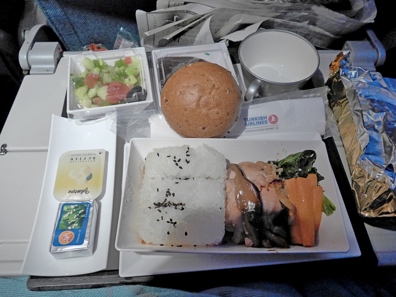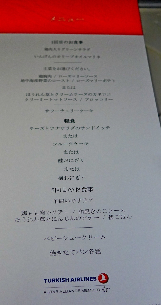 トルコ航空はKIX便は2往復使用したことがあるが,NRT便は初めて.まずスリッパと洗面用具が配られた.感激.食事もメニューが配られ,最初の食事は選択制(帰りは一方がなくなっていたので選択できなかったが).二回ともホットミール(帰りのIST−KIXの深夜便でも二回のホットミールが出たのには閉口したが).ワインもおいしくて,エンターテイメントシステムも画面も大きく見やすく,オンデマンド.映画の種類も多く5本も見てしまった!エコノミーでこれだけなら満足.シートも狭いながらも良く,ヘッドレストが曲り,頭を固定できるので寝やすい.