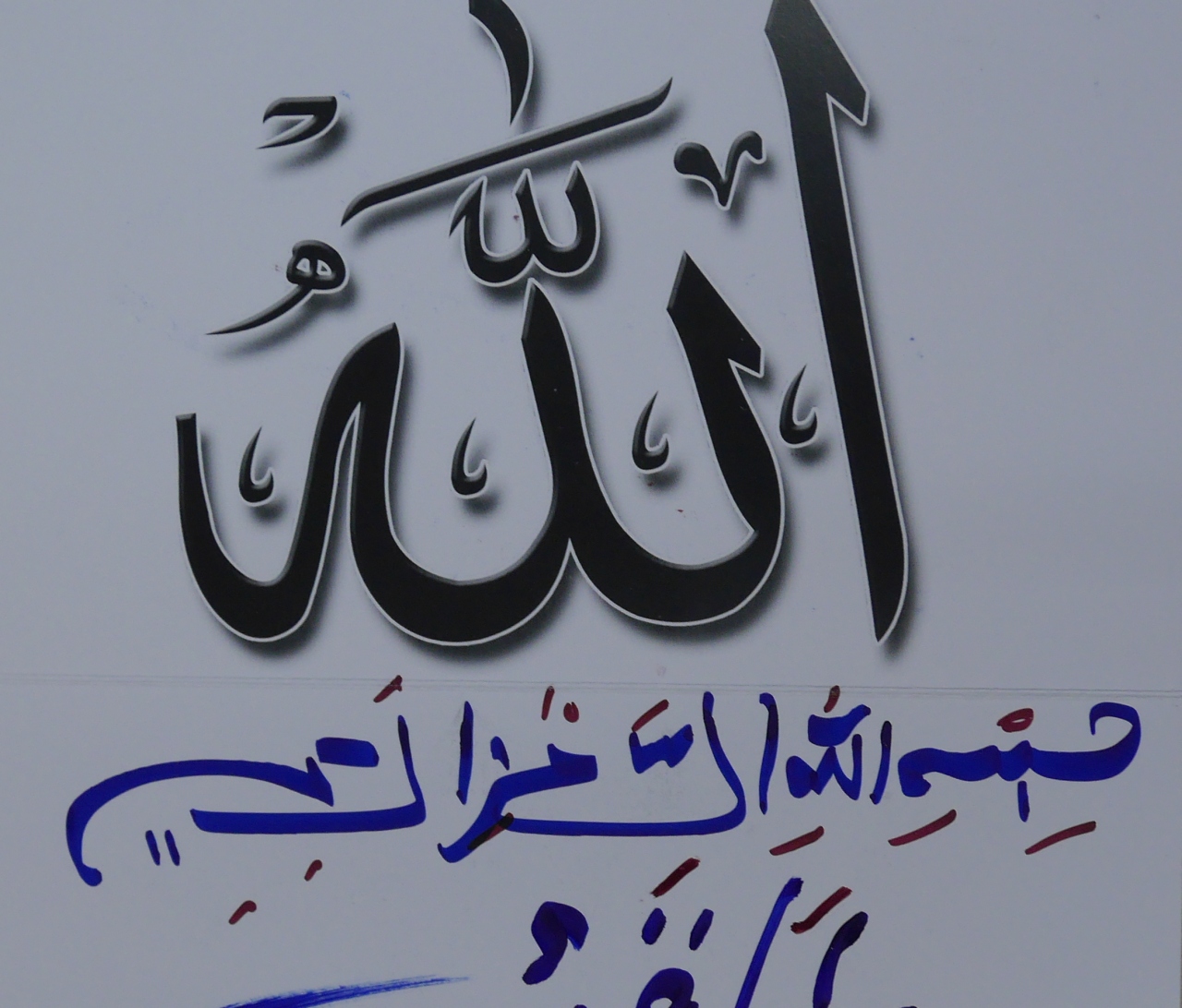 右隣の店では,何か買うとサービスに,自分の名前をアラビア語で書いた色紙をくれる
