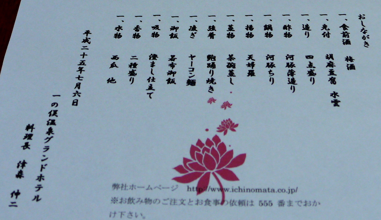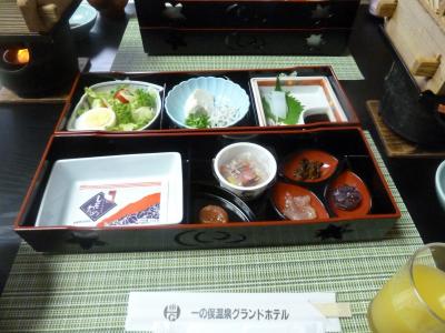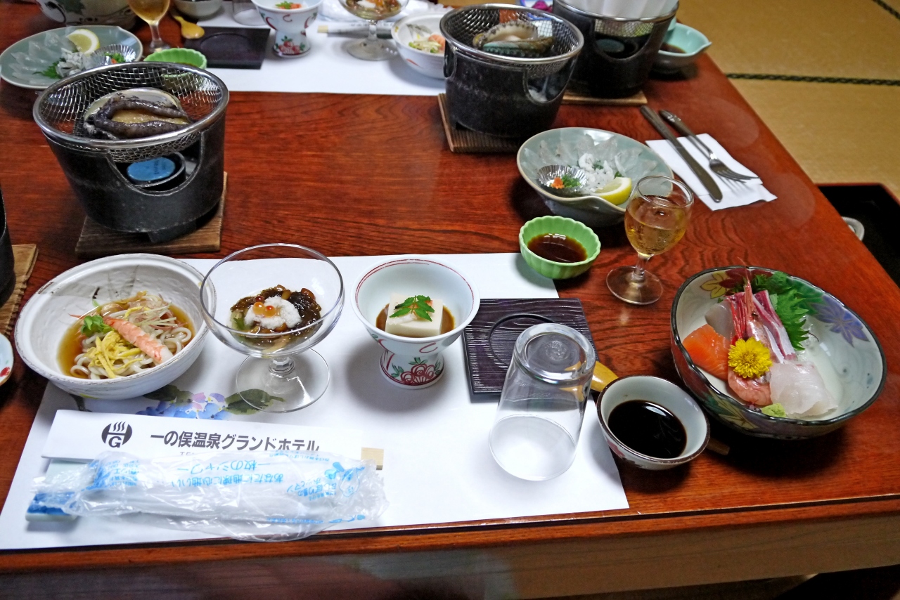 山の中にある割には大きなホテル.庭が広く良く手入れされている.周りの風景は取り立てたものはない.庭をめでるのみ.部屋も大きさはまあまあ.二人でとまり一人16950円(週末料金).若干そろそろリフォームしたほうがいい古さだ.バストイレ付.温泉はいい.今回はゆっくりしたくて,またサウナにゆっくり入りたくてここにした.風呂は素晴らしい.まるでよくある,都会の温泉のよう.露天風呂や打たせ湯,サウナなどがある..私はサウナが好きなのでどうしても大きなホテルになる.http://ichinomata.co.jp/grand/spa/index.html
