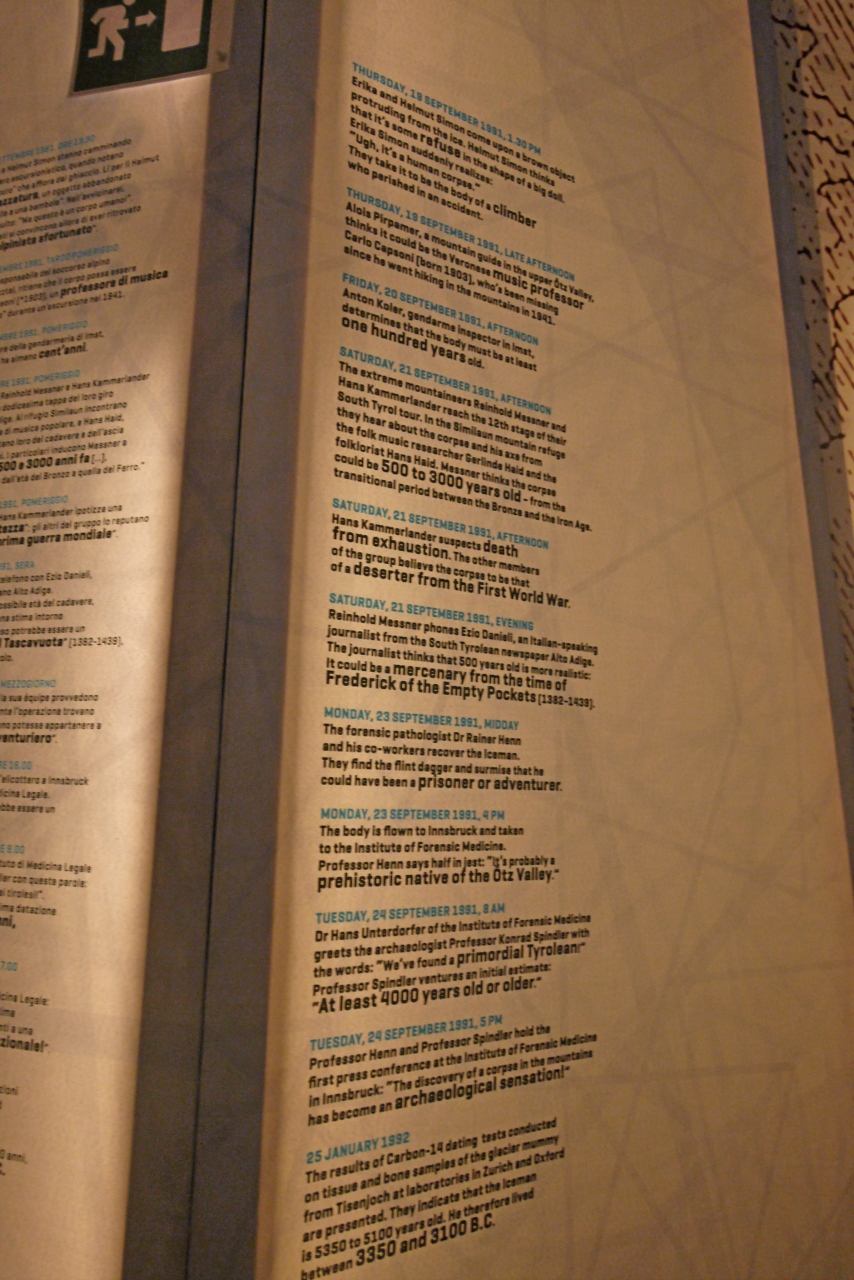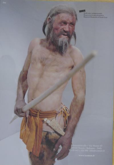 2004年にも考古学博物館でアイスマン(Otzi)をみたが,10年近くたって展示も一新.見やすくなっていた.アイスマンもガラス越しに見ることができる.湿度99%,マイナス6度の中で皮膚はびしょびしょだったが,つぼにほった刺青は良くわかった.遺品もわかりやすく展示されている.しかしまれでアイスマン博物館になっていた.以前あった南チロル地方の考古学展示は姿をけし,三階は子供たち用の学習のためのフロアになっていた.アイスマンは世界的に有名だが,ローマ帝国の北方,このあたりの考古学的展示も見たかった