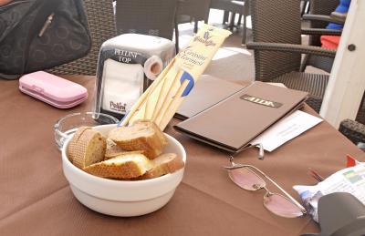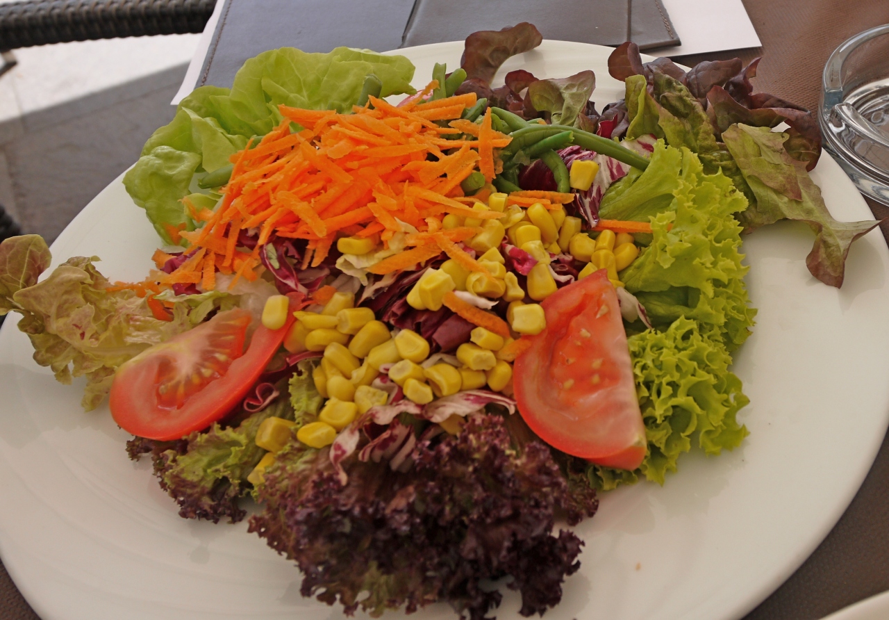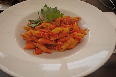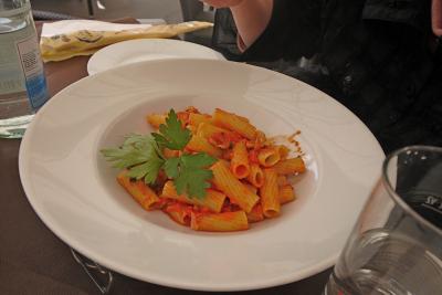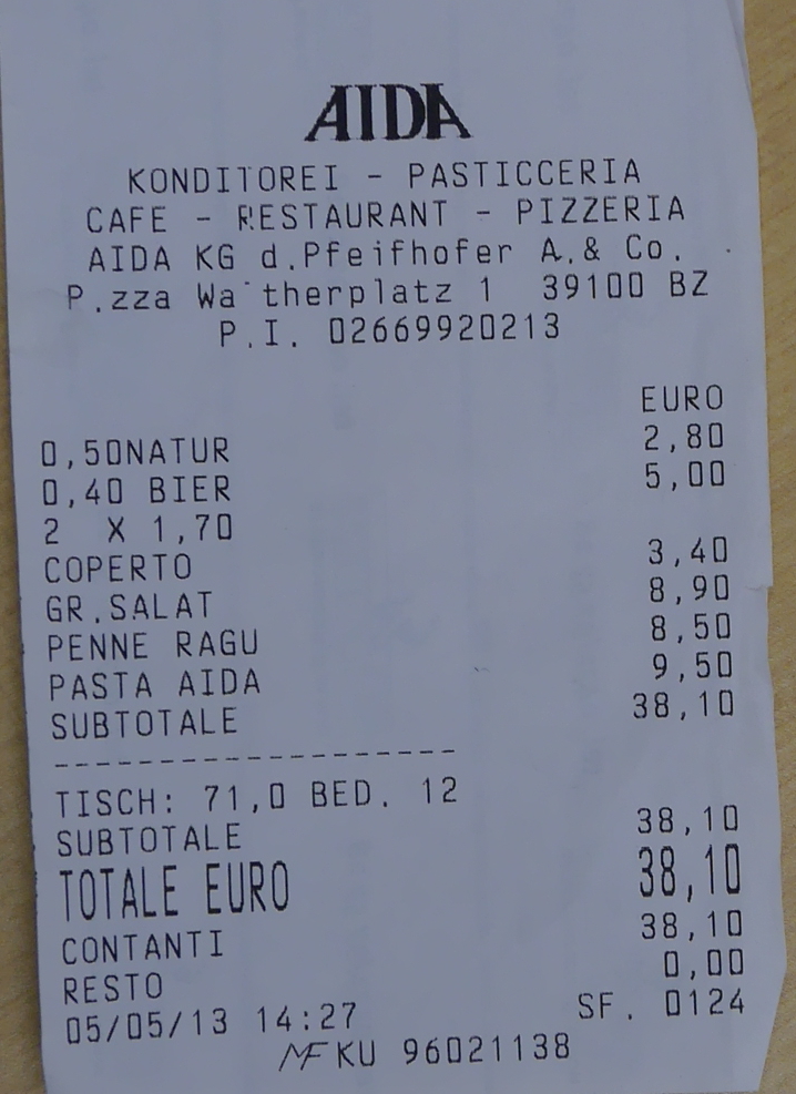 AIDAという店の屋外の席に,水2.8ユーロ,スナック・パン Copertoというテーブルチャージ1.7ユーロ.0.5Lビール5ユーロ サラダ8.9ユーロ,アイーダパスタ9.5ユーロ ポロネーゼ8.5ユーロしめて38.1ユーロ.パスタは割とおいしかった.イタリアではサラダはバルサミコとオリーブオイルで食べるが,これがまたおいしい.広場のDuomoが見える最高の場所ではまあまあのレストラン