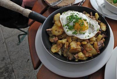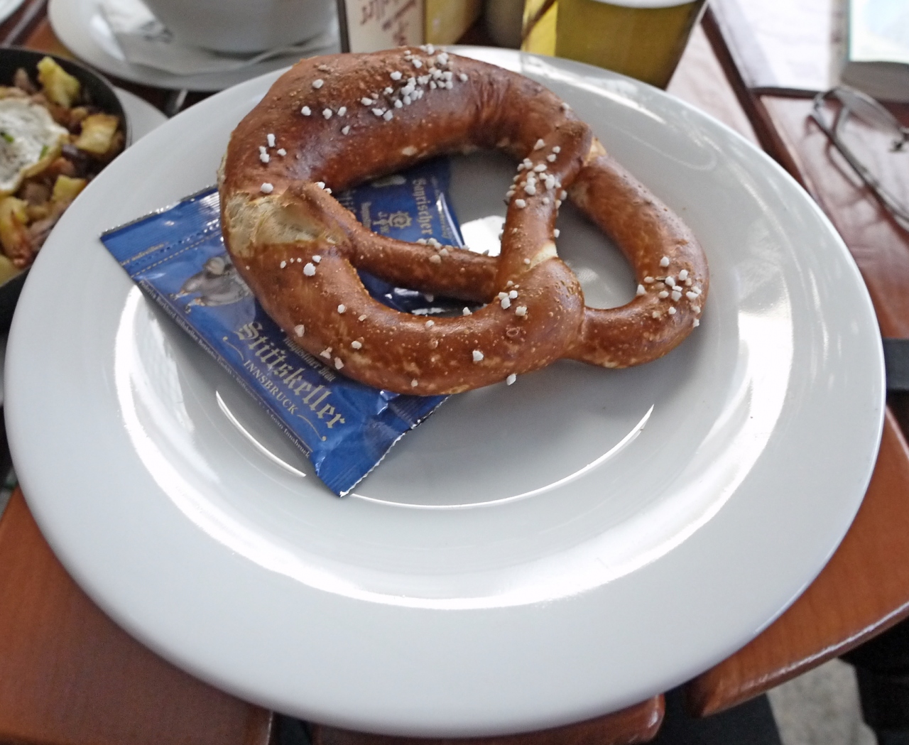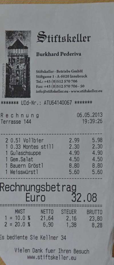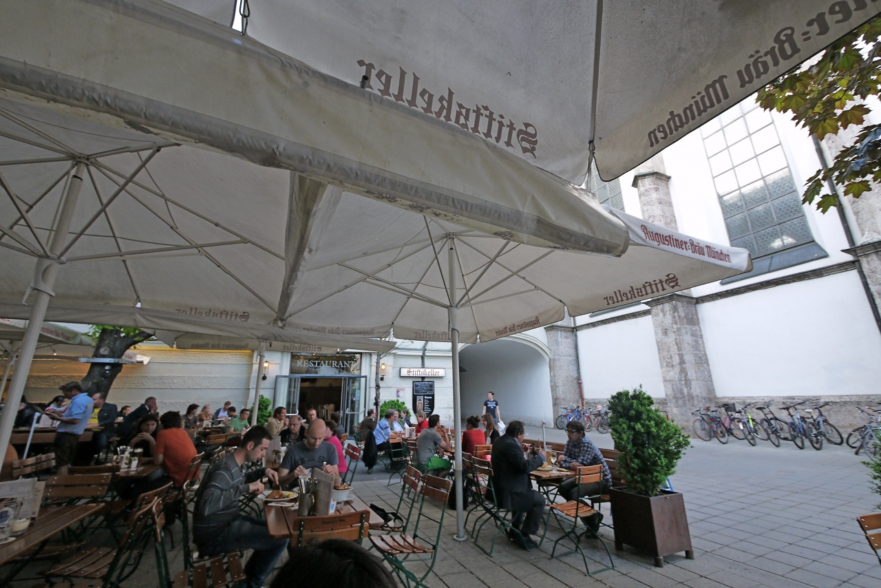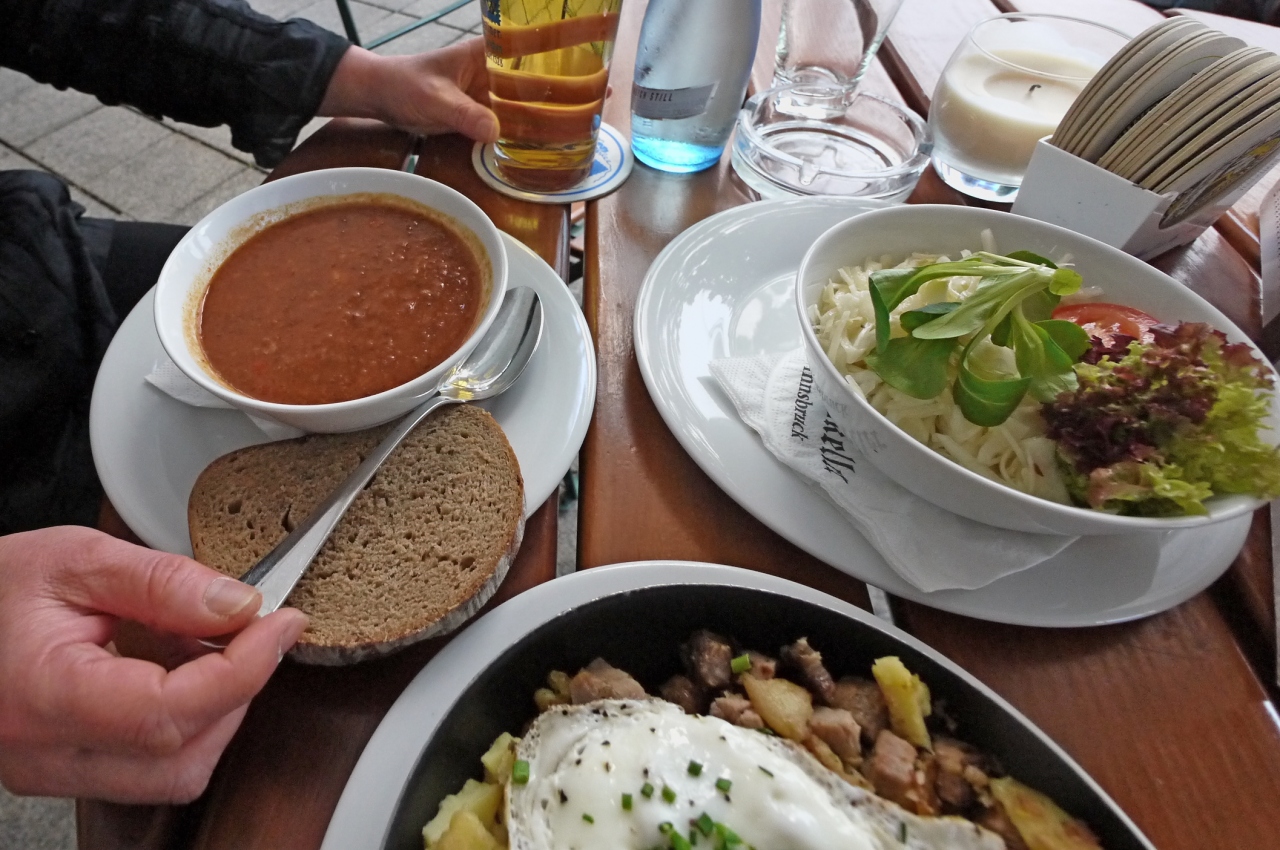なんといっても場所が便利,黄金の小屋根から王宮の南を通り,宮廷教会の前にある.中よりも外で食べるほうが開放的.ビールが安くておいしい.2.99ユーロ.食べ物もBauern Grost 8.8ユーロをはじめ,グヤーシュスープやホワイトソーセージなどおいしかった.ビール二杯と水とあまり飲まなかったが,32.08ユーロと安かった.便利な場所だし,なんといっても肩がこらないのがいい