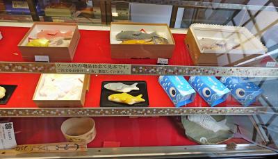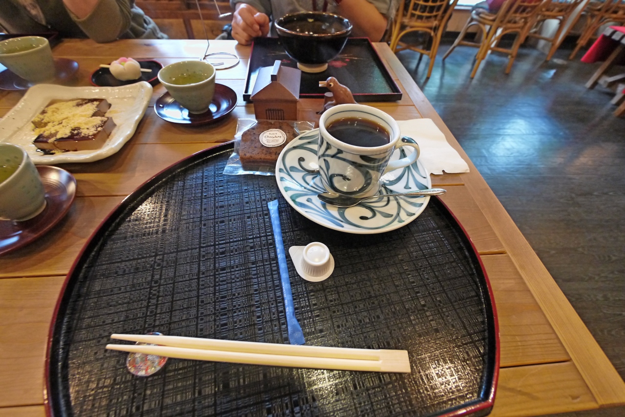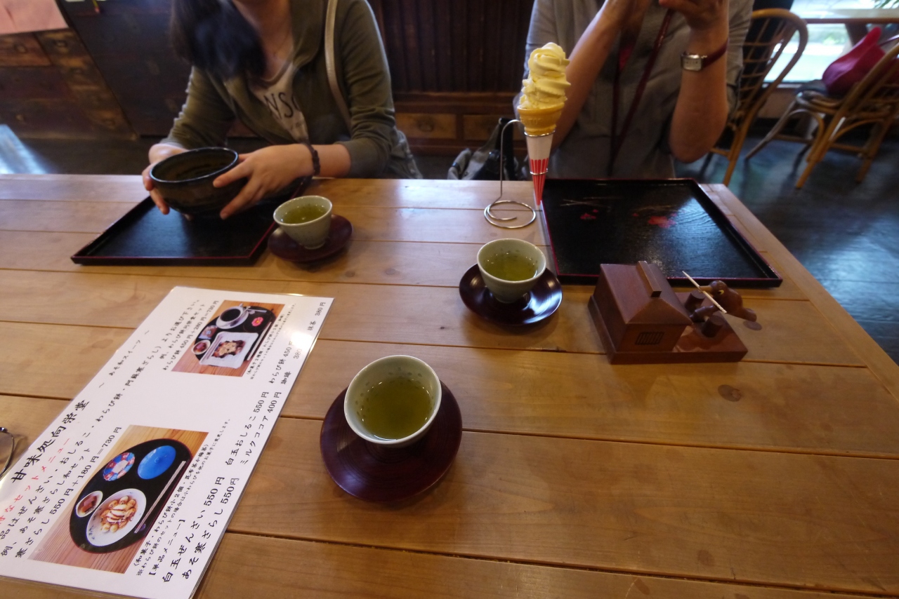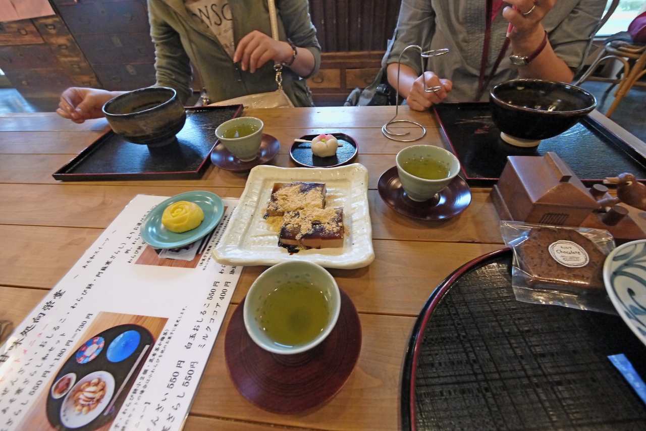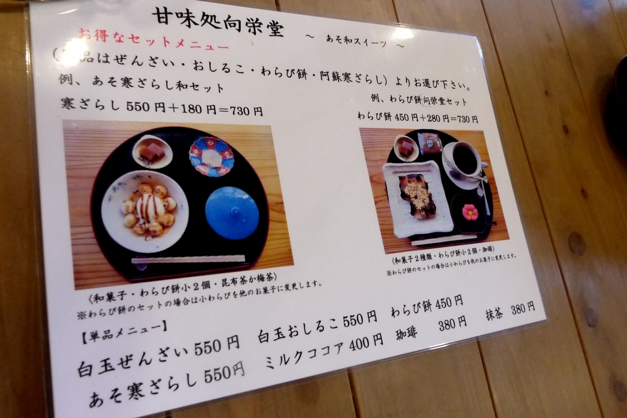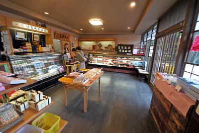 雨の阿蘇神社,宮地湧水群見学の際による.阿蘇の白雪で有名.260円と安い落雁 店内には古い菓子作りに使っていた道具を展示 同僚は抹茶380円,わたしはわらびもちセット730円.和菓子2つと洋菓子1つ着いた豪華版だった.散歩の後に寄るには開放的でお菓子もおいしくいいと思う