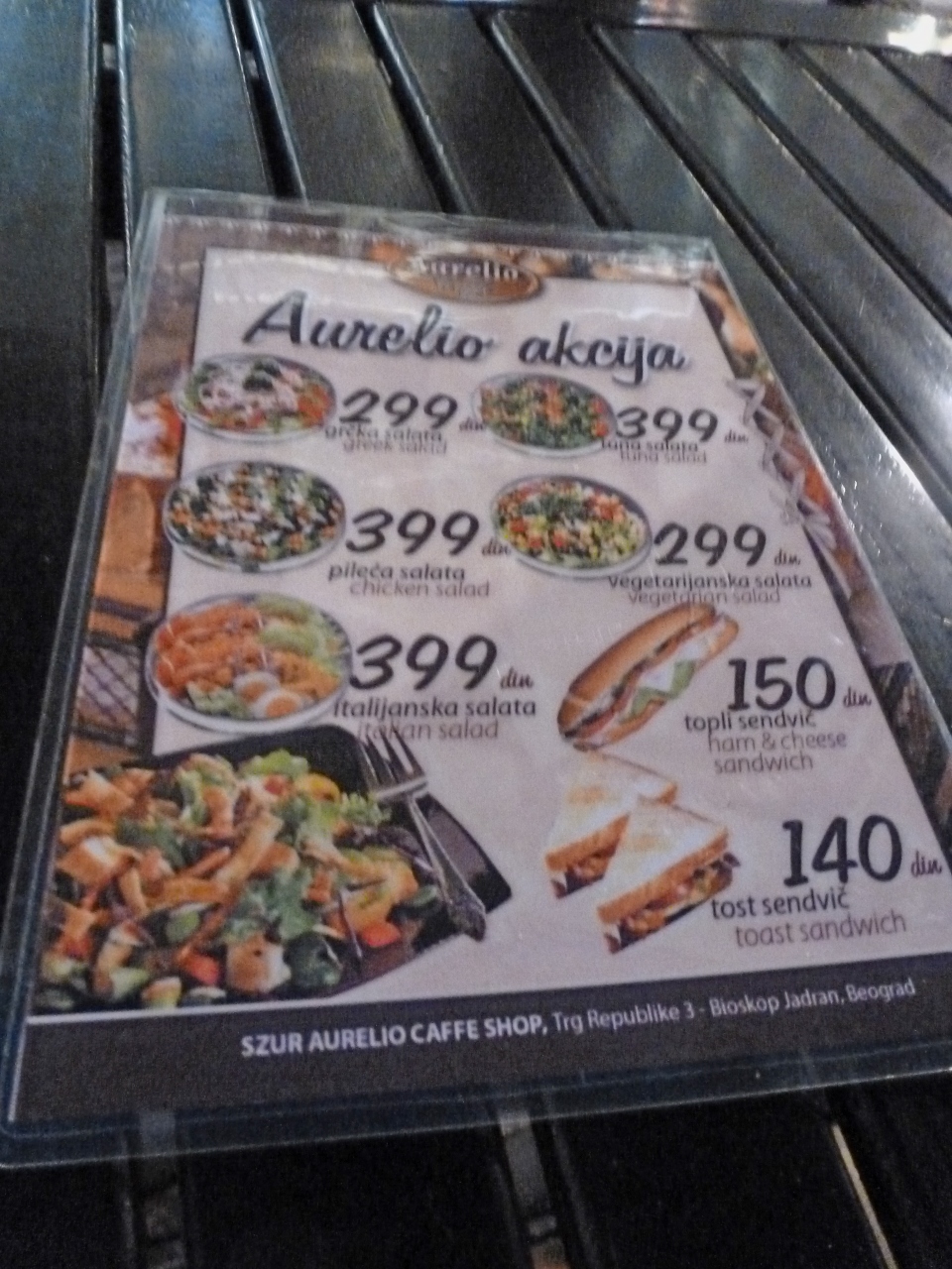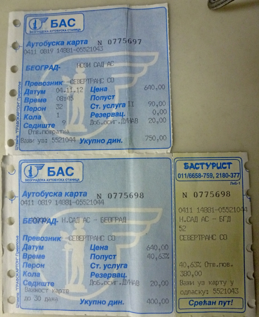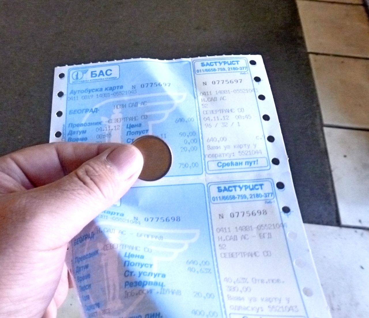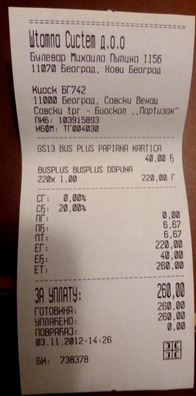 Kioskで40DINでバスプラスを購入.便利なプリペイドカード.紙製40DON,3か月有効.(3年有効のプラスチックカードは250DIN)実際は220DINをいれて(少なくともトラム3回は乗れる.実際には2回しか乗らなかったので60DIN×2=120DINで100DIN損してしまったが.)260DIN払った.Kioskの女性が英語がわからないので適当にされたが,むしろ3回分ならつり銭なく220DIN,4回分なら280DIN用意して買うとよい.超便利