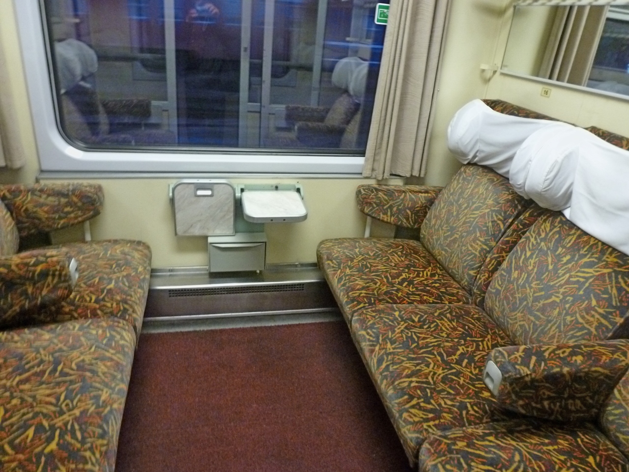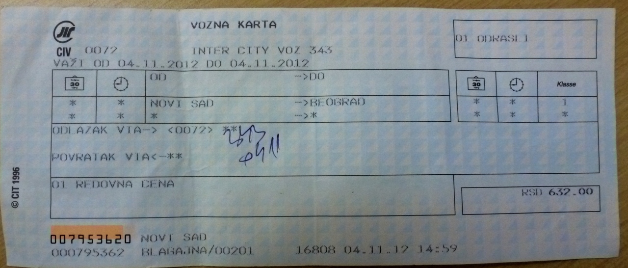 Novi SadからBeogradeまでBudapest Keleti発の国際列車に乗る.1等は東ヨーロッパの国際列車の6人掛け.バスは往復1150DIN 片道750DIN 1等でも632DINとバスより安い.往復券だとバスのほうが安くなる,バスの微妙な価格設定だが,楽しさは列車のほうが当然ある!ただ防弾チョッキを着た2人の武装警察官に職務質問をされた.パスポートを見せろと言われた後,宿泊先を聞かれ,「セルビアは本当は宿泊証明書が必要だ」と嫌味を言われた.もしかしたらホテルから宿泊証明書をもらっていたほうがよいかも,簡単にもらえる.私は偶然に時間が合い乗ることができたが,きちんと時刻表を調べたい人は