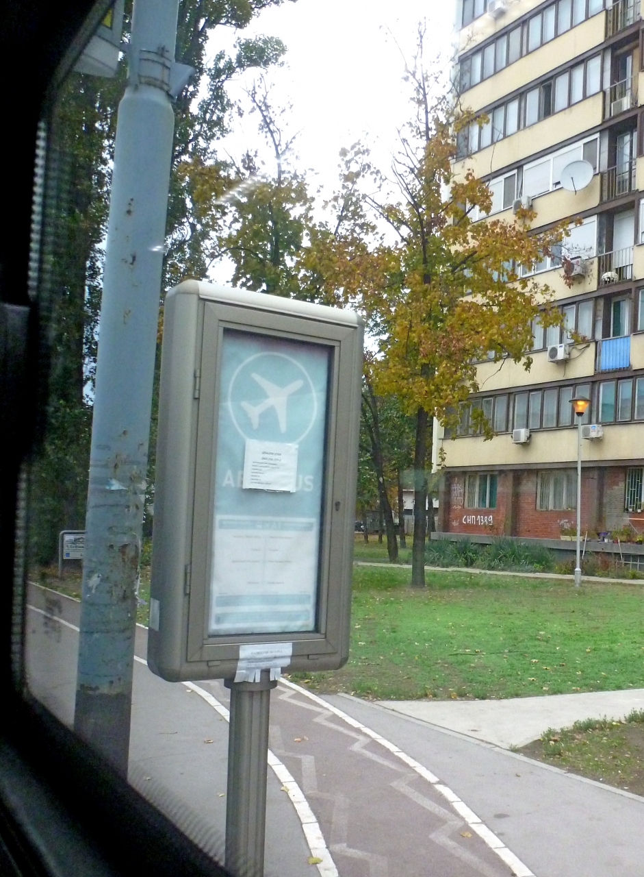 空港からタクシーも使えるが,ぼられるのには不安,あるいはホテルがベオグラード駅前,スラヴィア広場近くならば,20分おきの空港バスが便利.300DIN(273円)と安い.バス停は飛行機のマークがあるのですぐわかる.空港,スラヴィア広場 毎時 0 20 40分発.地図と詳細はhttp://www.beg.aero/upload/map_timetable.jpg