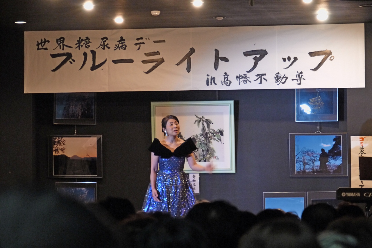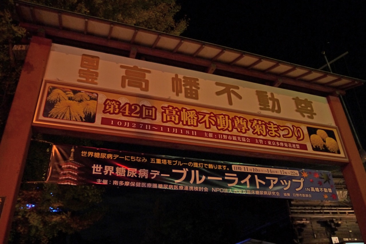 2012年11月10日から14日にかけて,世界糖尿病デーにちなんで南多摩糖尿病医療連携検討会・NPO法人西東京臨床糖尿病研究会の共催,真言宗智山派別格本山「高幡不動尊金剛寺」の協力を得て,糖尿病のシンボル ブルーサークルにちなみ,ブルーにライトアップした.万燈会の提灯にブルーライトをいれた.今年清水寺のブルーライトアップもみてきたが,むしろ提灯のほうが明るく,とてもきれいだった.2013年以降も行う予定なので,11月14日ごろぜひ高幡不動に来てほしい.