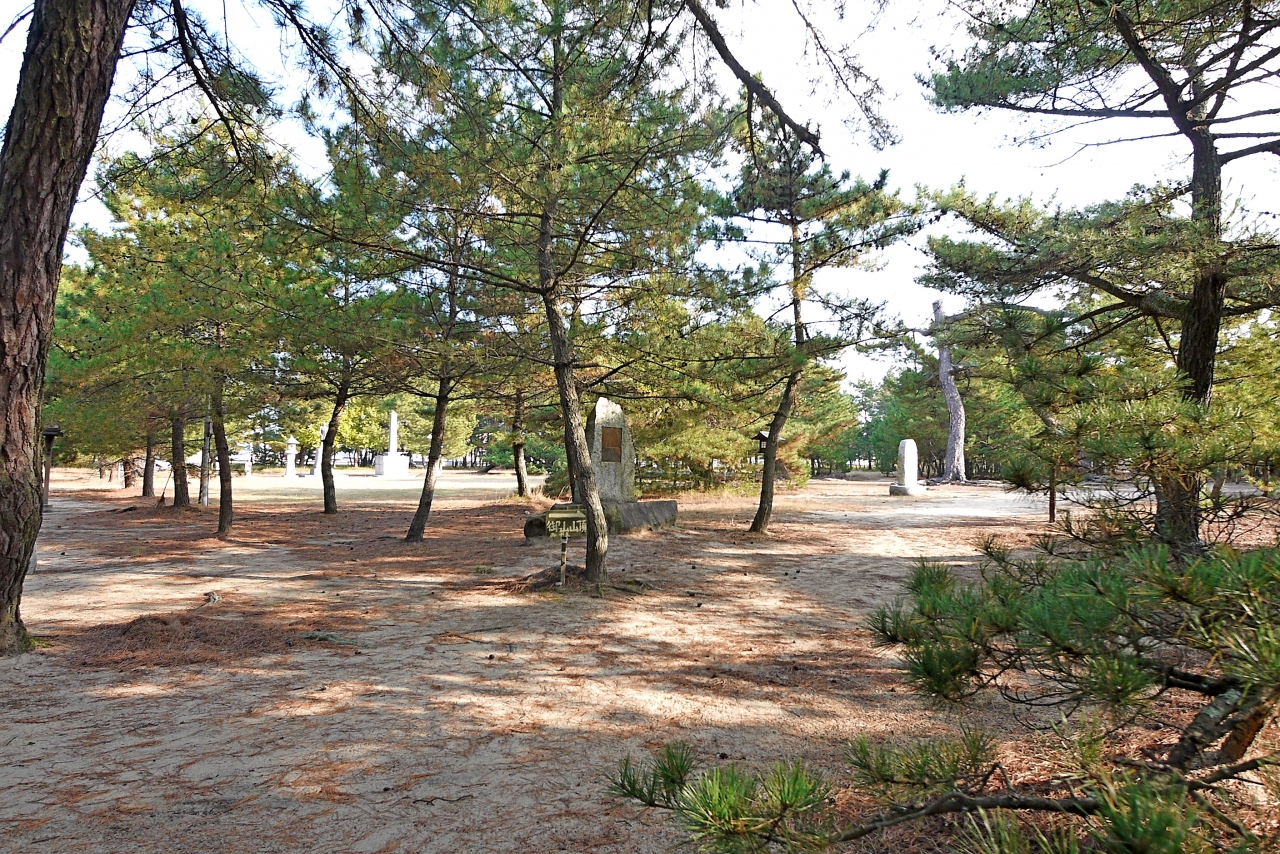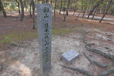 白鳥神社の境内にある.白鳥松原の中.白鳥神社の宮司さんが親切で案内してくれた.境内にある標高3.6mの山。白鳥神社では『日本一低い山』とうたっているが、国土地理院に日本一低い山と認められる為に、国土地理院発行2万5千分の1の地形図に掲載される事を目標としている。また白鳥神社で登山証明書を発行している。(Wikipedia)