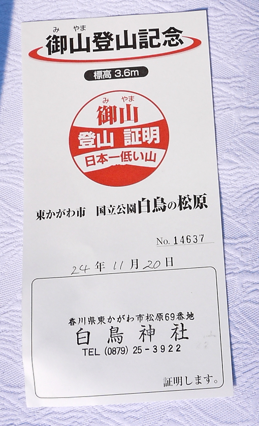 日本で一番低い山,白鳥神社のそばのお店で登山証明書をもらえる