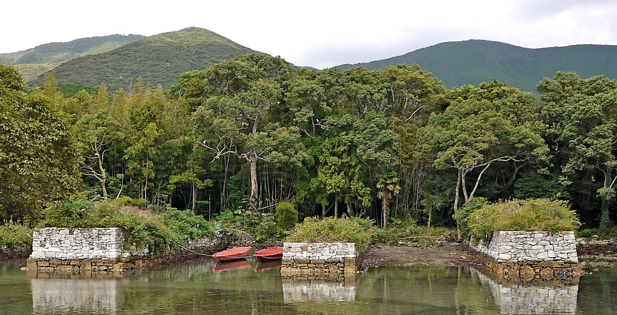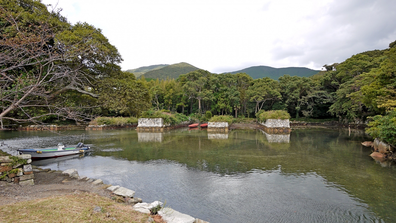 突堤は鏡石を配した石積みで造られ、原形を良好にとどめています。正門、倉庫、休息所などの建物の遺構も残っており、往時の壮大な規模をうかがうことができます。そして、陸上には造船場があり、船大工や水夫たちの納屋があったといいます。