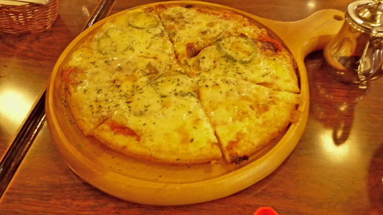 あまりおなかが減っていなかったので,私はピザ,家人はグラタンを注文.コーヒーは割とおいしかった.サイホンで入れる.グラタンはパンとサラダ付き.雰囲気は普通のコーヒー専門店だが,古寺めぐりで疲れた時にはいいと思うし,軽い昼食ならここでも十分だ.