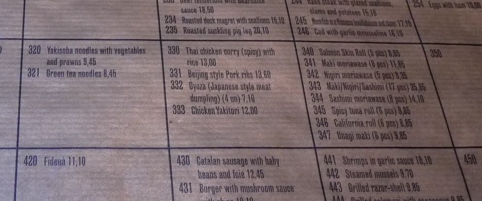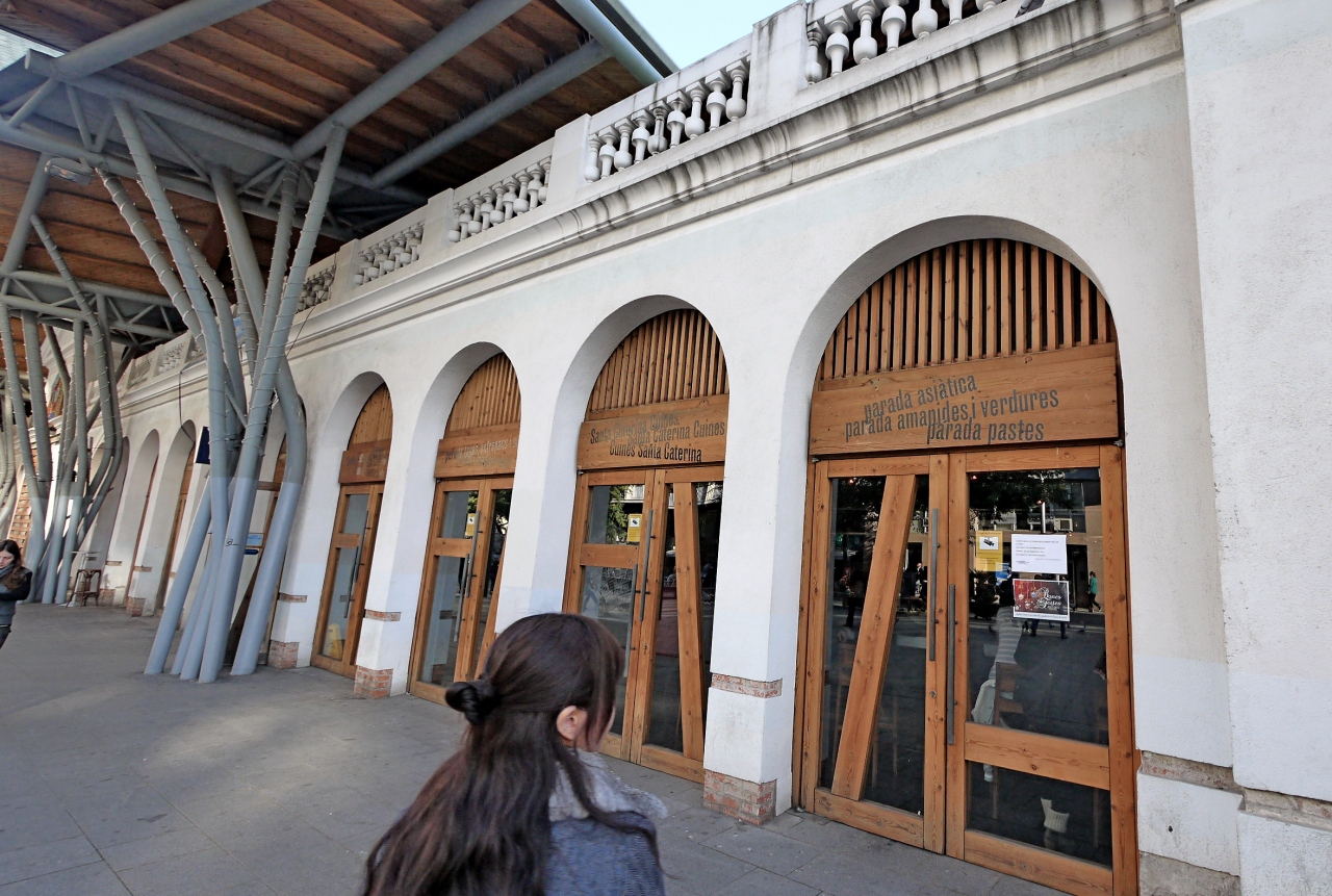 Cuines Santa Catarinaの食事は美味しかった.イベリアハムとパエリアは絶対おすすめ!特にパエリアは普通のトマト味ではなく,魚醤のようなうまみを持った味!こんなおいしいパエリアには初めて会った.ぜひ食べてみてほしい!おどろいたことに餃子や焼きそば,かんぴょう巻,味噌汁などオリエンタル料理と称している日本料理が多かった!餃子は食べたが,たれはねぎと醤油でラー油なしでこちらの人の口に合わせてあったが おいしかった.