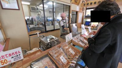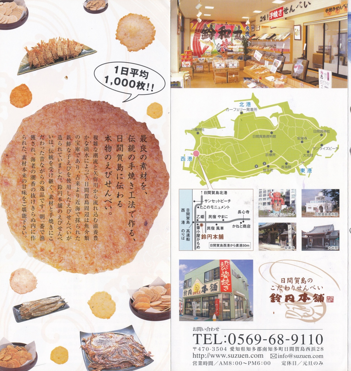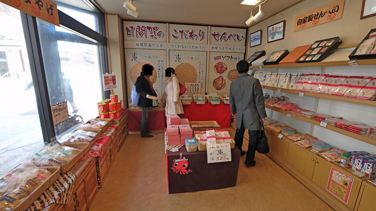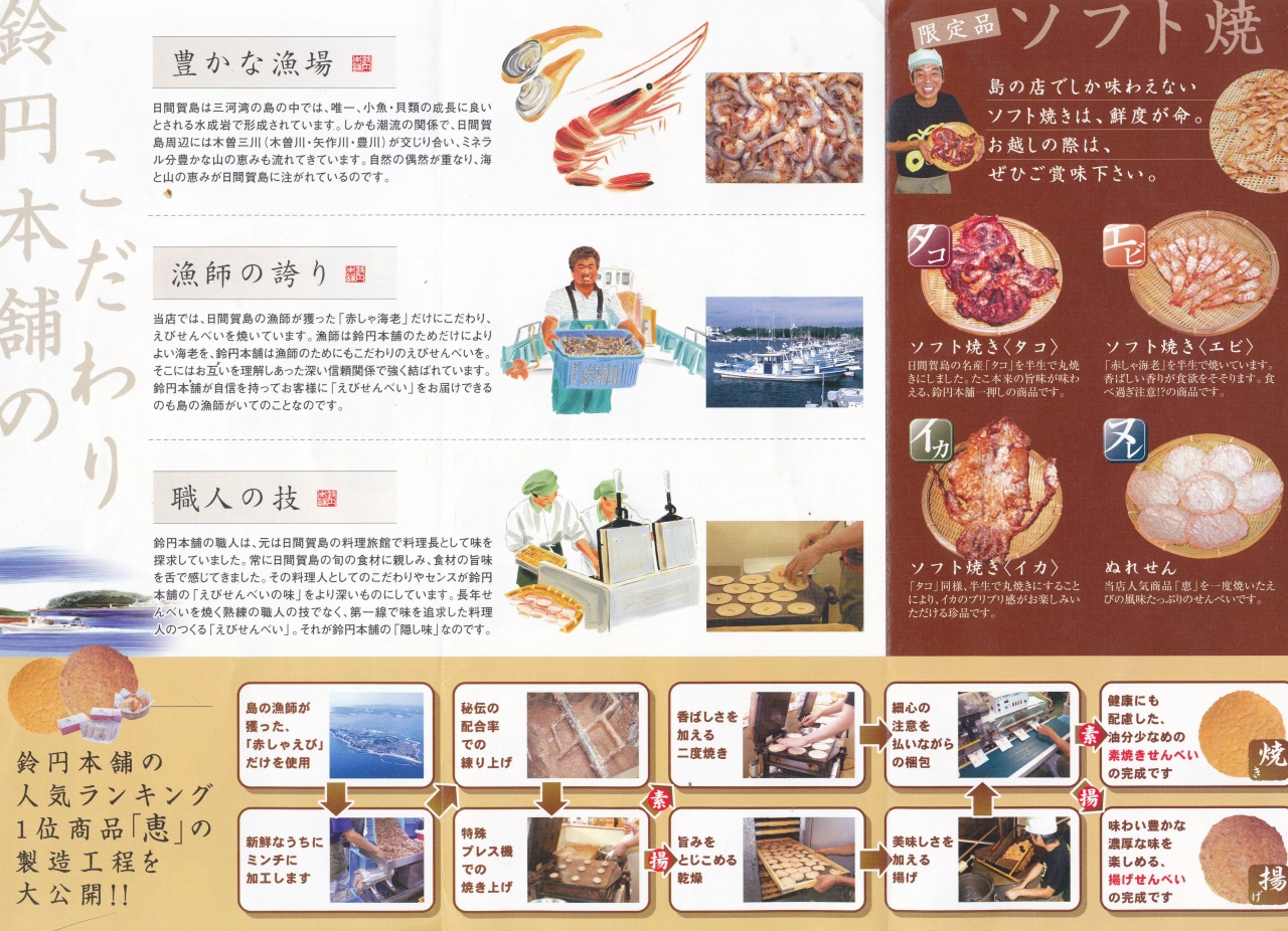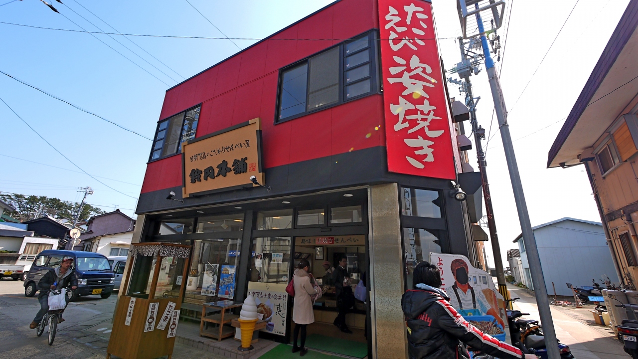 日間賀島西港,船を降りて,まっすぐ.旅館乙姫の隣にある,せんべい専門店.えびせんべい,ソフトせんべいなどおいしい.お土産に最適と思う.手焼きのせんべい,焼き立てをごちそうになったがとてもおいしかった.
