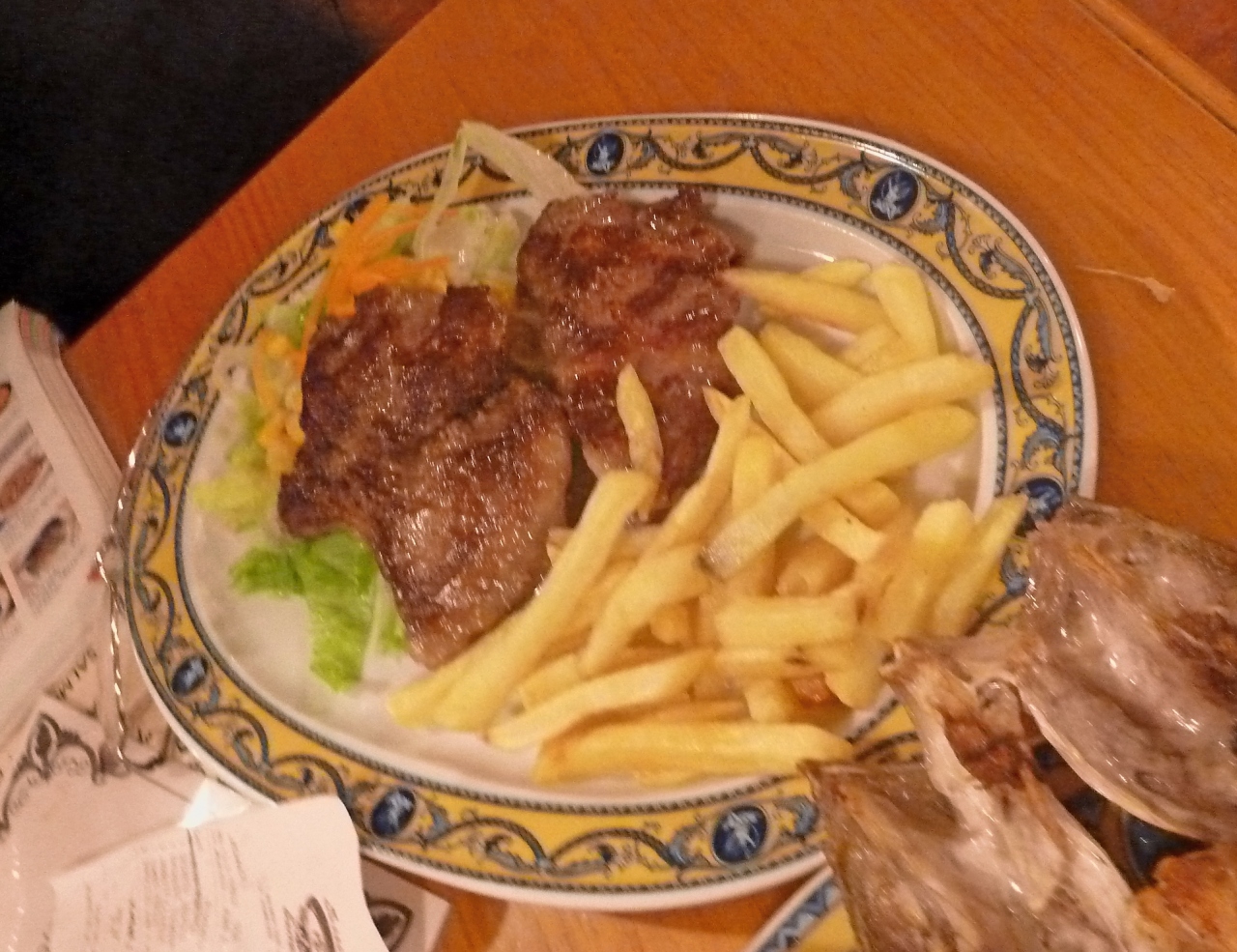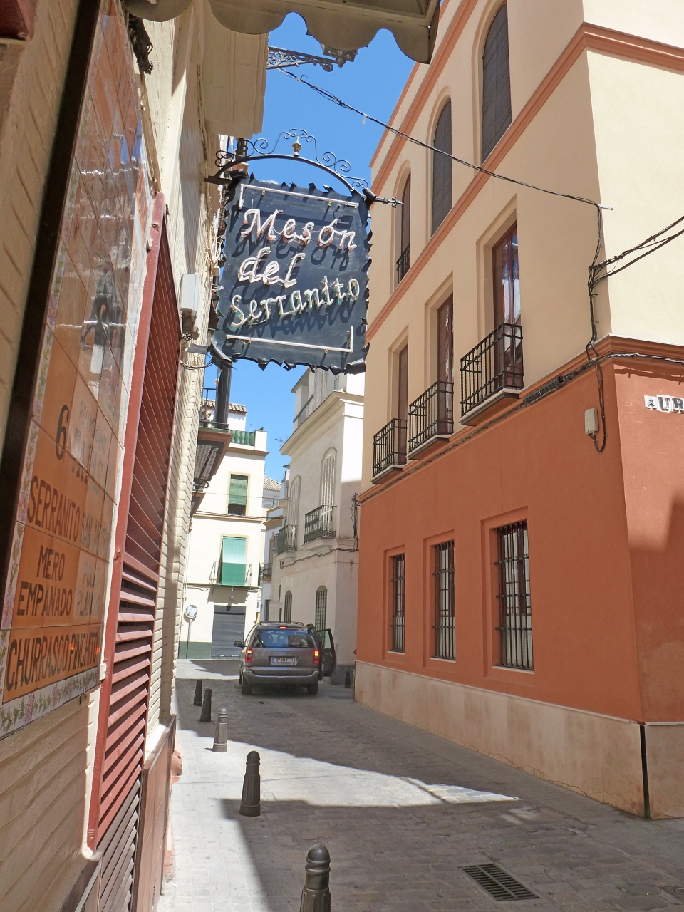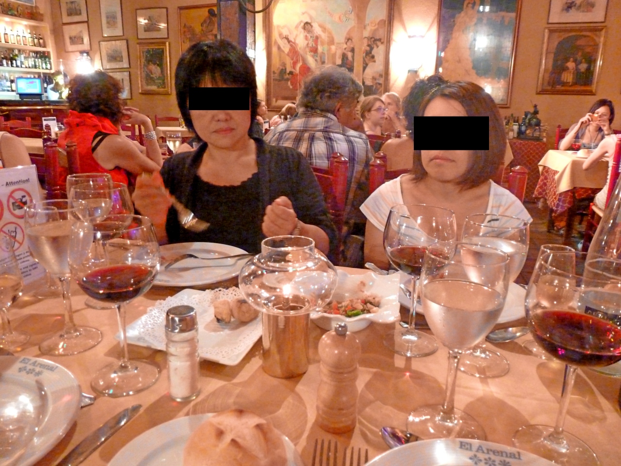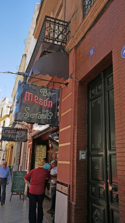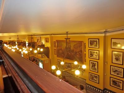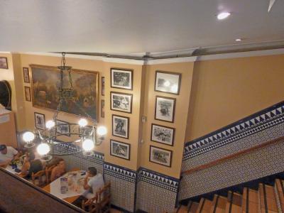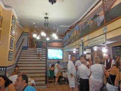 店の中は人でごった返している.いかにも庶民的雰囲気.カウンターでメニューを見ながら頼む.一応英語のメニューあるがレジで並んでいるので,選んでいる余裕はあまりない.料金もここで支払う.あとで食事ができたらカウンターまで自分で取りに来るセルフサービス.その時に名前で呼ばれるのだが,日本人の名前は難しく,かってに「JUAO」という名前にするといわれた. 大きなマイクで「Juao]といわれてから取りに行った.英語は通じる.ビール,料理占めて4人で61.2ユーロ.まあまあの値段かな..決して安くはないが,高くはない闘牛場のそば,そのため闘牛で装飾..にぎやかで雑踏の中で食べてるような雰囲気には閉口したが,昼食として気軽に食べるには良い店だし,スペインの庶民のエネルギーをもらうには良い店だ.