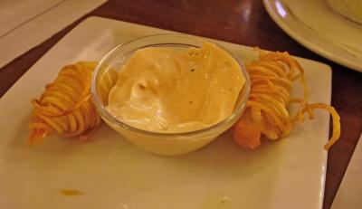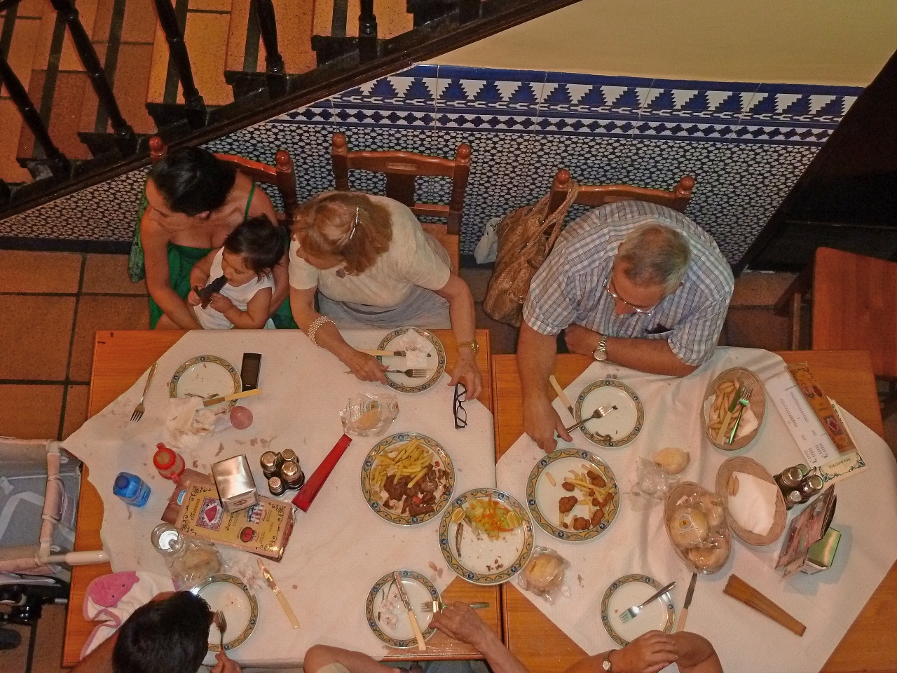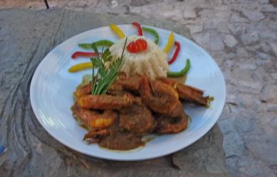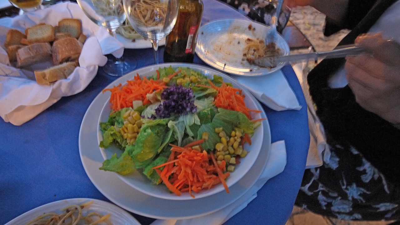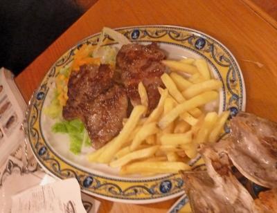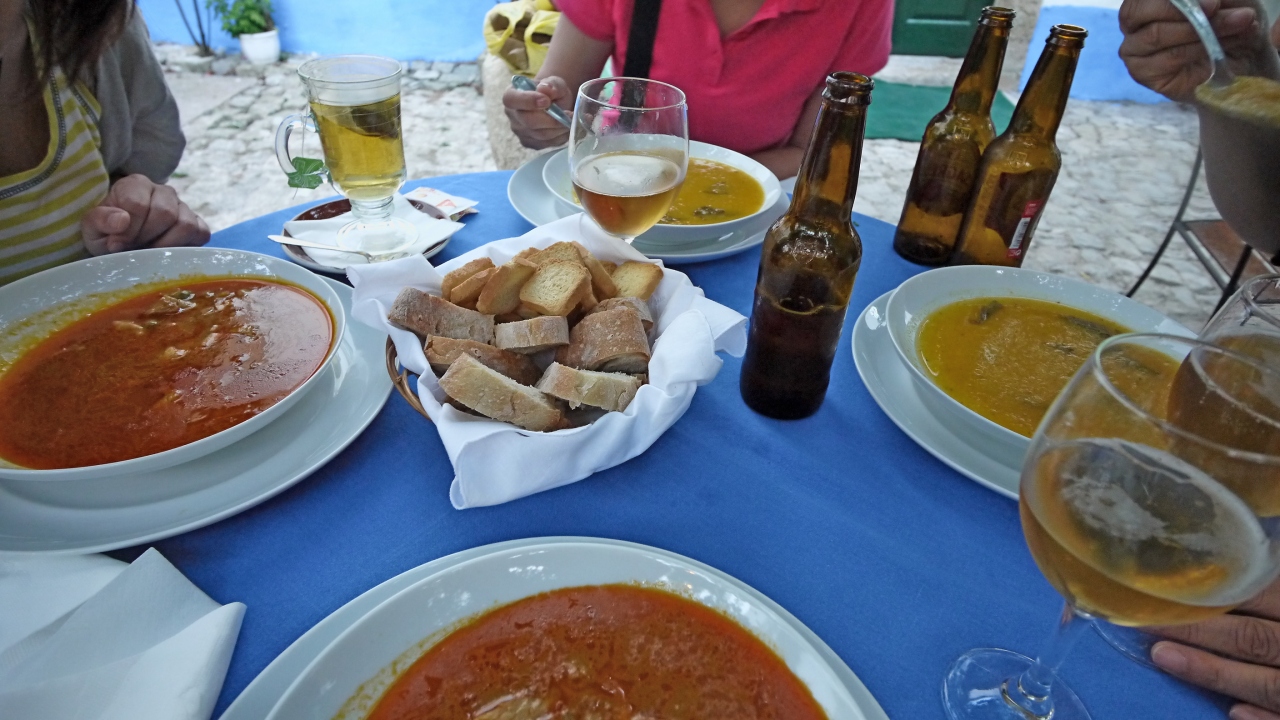 Hotel Estalagem do Combentに近い城壁の内部のRestorante Pretensiosoに入る.オレンジの木の下の庭で夕食.ポルトガルの気候はアンダルシアに比べて涼しい.しかし肌寒くはなく,今回の旅行最後の夜をゆっくり楽しめた.4人で食べて飲んで,しめて85ユーロ!!安かった.おすすめのレストラン.しかし2030を過ぎると満席になったので,早い時間に行くのが妥当.食事はゆっくりと出てくるので,ゆったりした気持ちで歓談しながら待つとよい.パンとビールは早く来るので小腹は満たせる.注文は野菜スープ2ユーロ,トマトスープ3ユーロ.サラダ2つ,6ユーロ.パスタ2つ 8と10ユーロ,エビ料理18ユーロ,ワインボトル15ユーロ,ビール2ユーロ4杯,茶2ユーロ.写真を撮るのを忘れたのがきわめておしいが,スープはおいしく,サラダはたっぷり.パスタもまあまあ.エビ料理はとてもおいしかった.やはりポルトガルのほうが物価は安い.ここで飲んだ赤ワイン15ユーロとは思えないおいしさだった.ここはお勧めのレストラン!!!