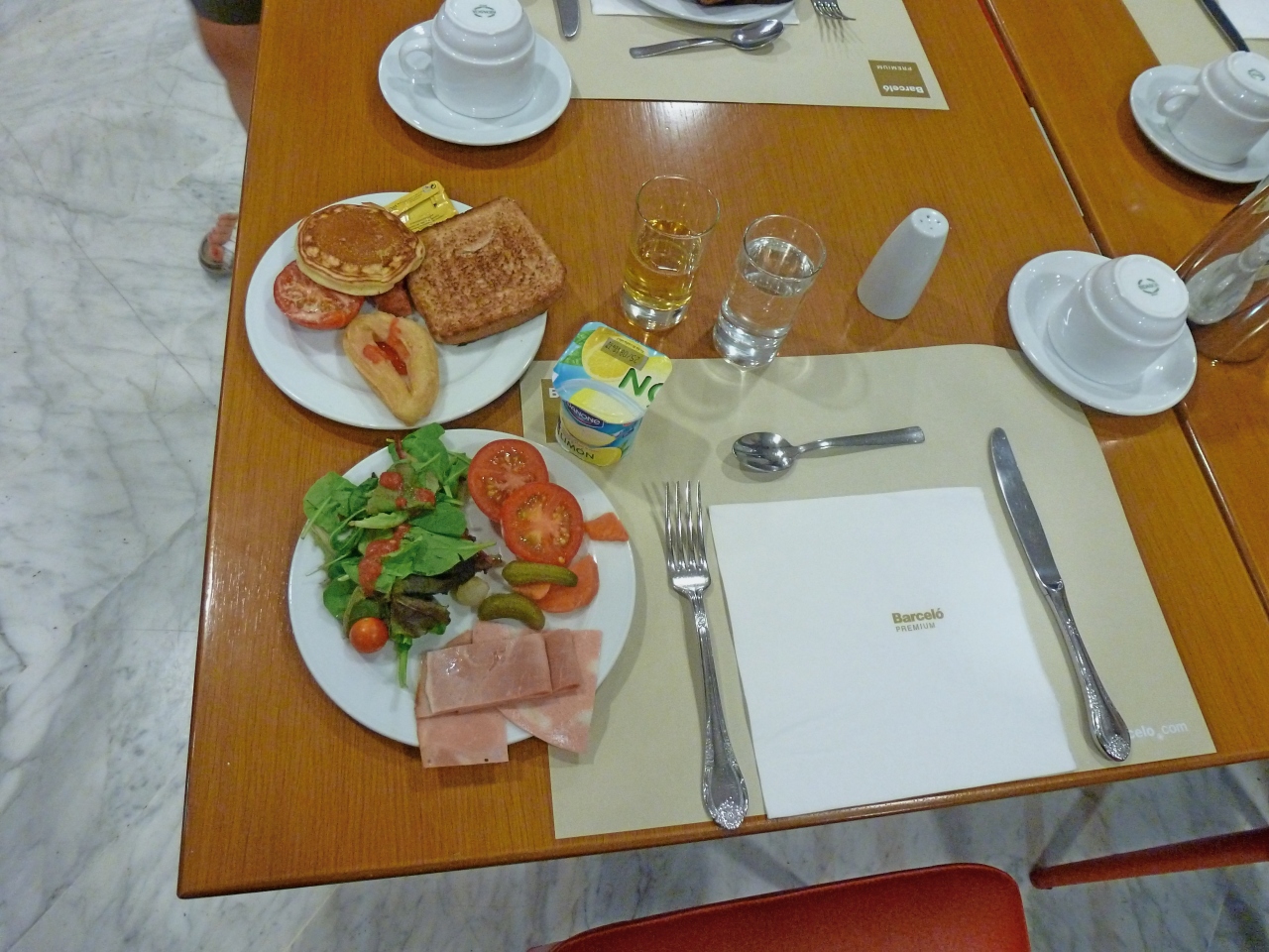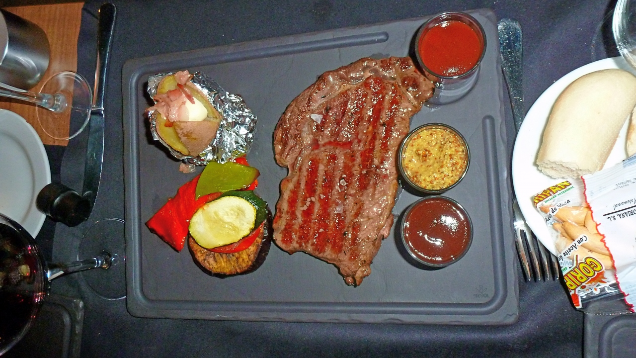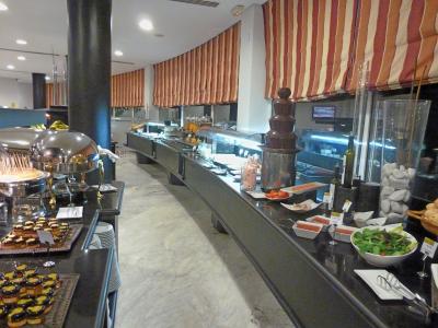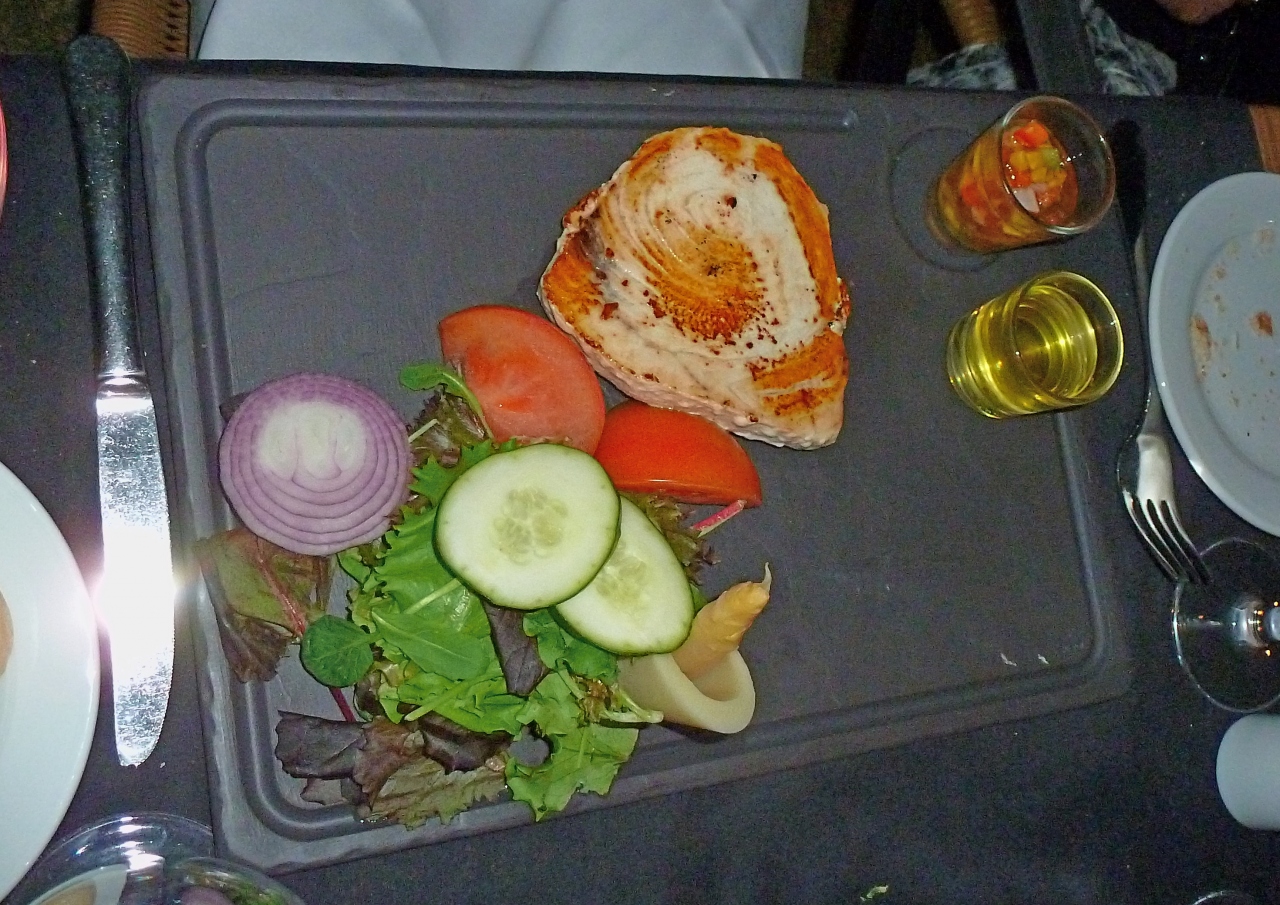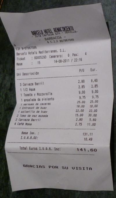 郊外のホテル,Hotel Barcelo RenacimientoのレストランBarbacoaで夕食を食べた.日中39度くらいなる猛暑のアンダルシア,夜の野外レストランは涼しい.雰囲気はいい,音楽の演奏もある.しかしウエーターは英語がほとんど話せない.まずビール.2.8ユーロ,水が2.85ユーロと水のほうが高い!サラダ9.75ユーロ.トマトとモッツァレラ9ユーロ.まぐろ25ユーロ.ひれステーキ18ユーロなどなど,しめて4人で141.6ユーロ.翌日の大衆レストランメソンセラニートと比べても高くない.コストベネフィットはとてもよかったと思う.このホテルに宿泊するならおすすめのレストラン!