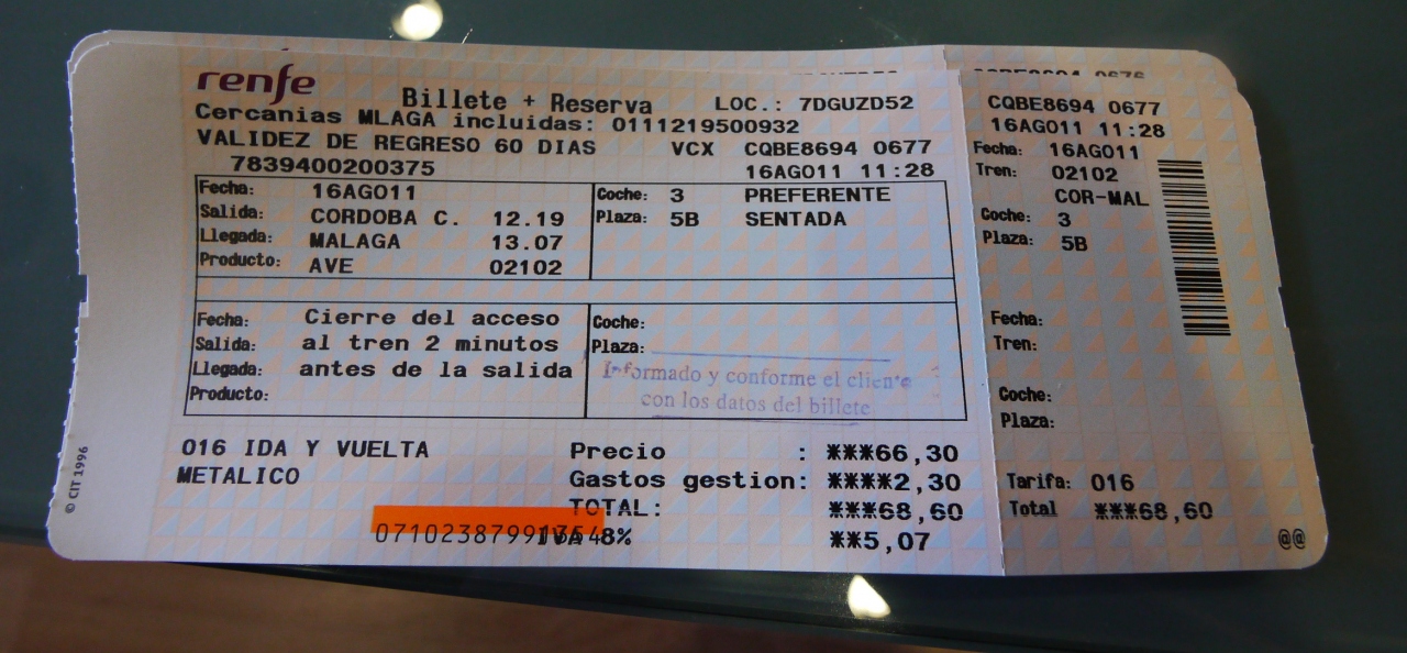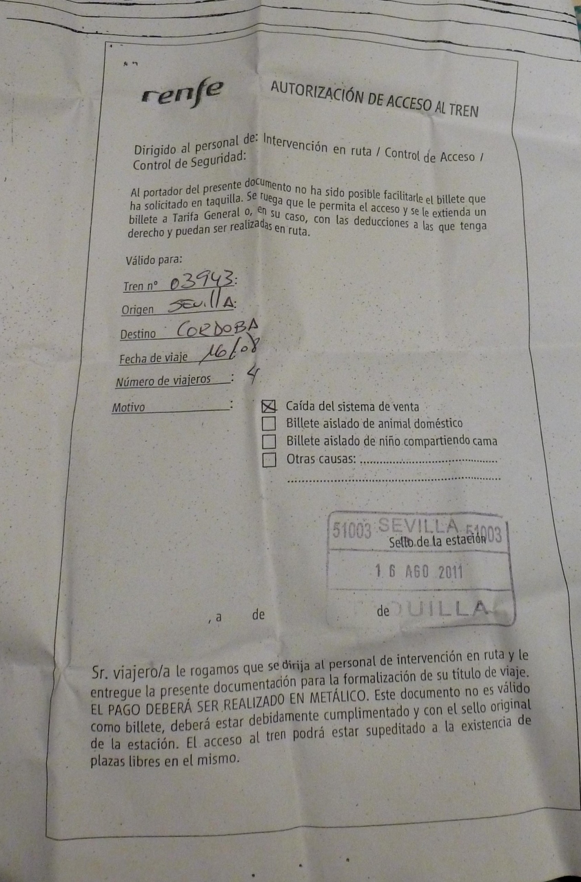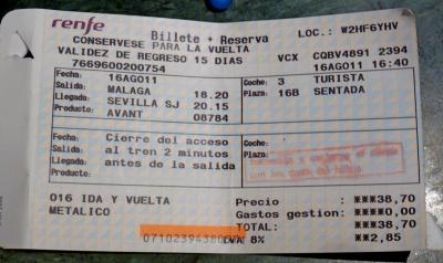 スペイン国鉄Renfeの乗車券を買うのに苦労する.Sevilla Santa Justa駅の窓口に13分前についたにもかかわらず,指定券が買えず,乗車証明書のみで車内へ.Cordobaでは長い列を待ち,Malagaまでの指定券は1等しかないとかわなければならなかったし,Malagaでも長い列を待ち,Sevillaまでの乗車券を満席ということで1本遅らした.これは4人席がないからという理由だったが,多分バラバラならあったはずだ.日本に比べ,指定券を買うのに大変!可能なら前日までに予約しておいたほうが無難と思った.