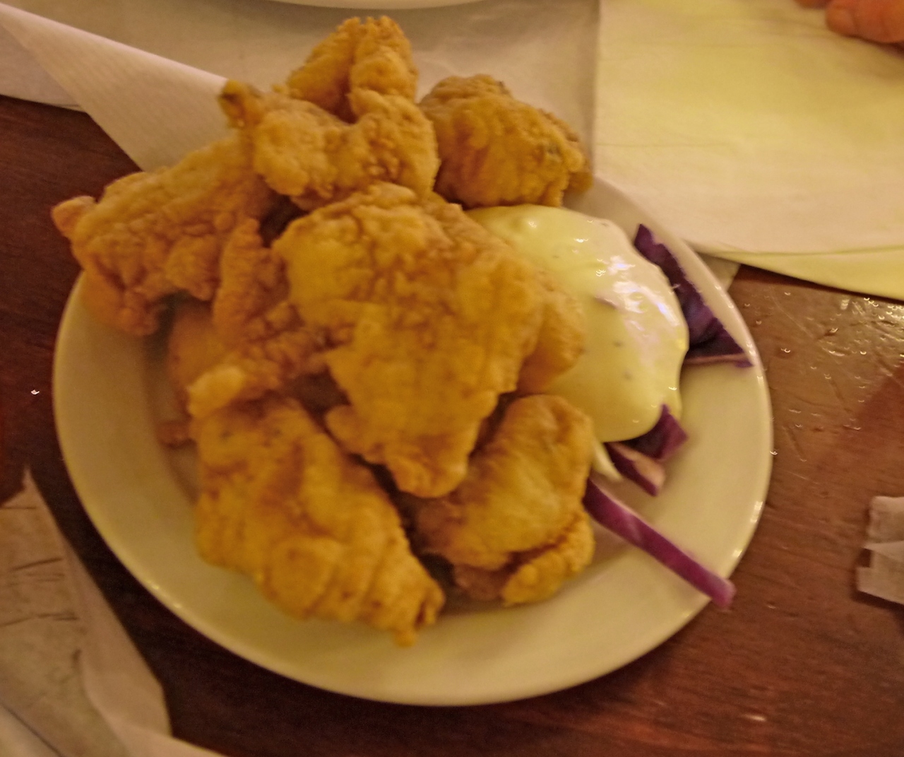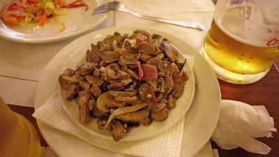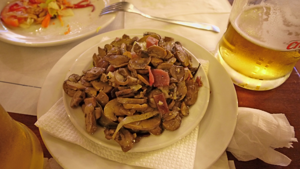 2階のGambarinusというCerveceriaビールレストランにはいる.ビールも揚げ物もおいしい.女性3人共どもだが37.6ユーロと安かった.ビールがおいしかった.つまみもおいしく,おすすめできる店だ.頼んだのはビール2.9ユーロ,紅茶(瓶に入った)1.9ユーロ,サラダ7.5ユーロ,6.85ユーロ.キノコの炒め物6.6ユーロ.エビの揚げたもの2.05ユーロ.チキンの揚げたもの2.4ユーロ.パン1.6ユーロ,占めて37.6ユーロ.疲れているせいか,食べてから写真を撮影した.