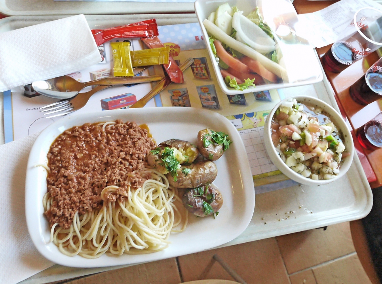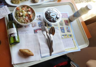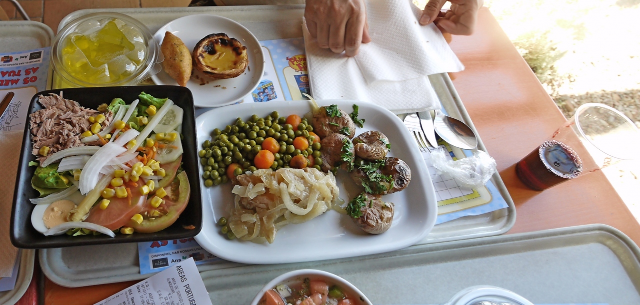 ポルトガルの高速道路には30kmおきにSAがあり,多くにカフェテリア式のレストランがある(ないところもある.そこでは売店のみ.特に地方で交通量が少ないところのようだ).安くておいしい.私たちはAlgarve地方の高速A2-E1線のSA,Almodovarで食事したが,4人でたっぷりたべて61.3ユーロ!!ボローニャスパゲティ9.95ユーロ,ガスパッチョ5.4ユーロ.ミックスサラダ2.75ユーロ,セットメニュー 13.95ユーロ,メロンフルーツ2.45ユーロなどやすかった.ここではAlmodovarのSAを紹介