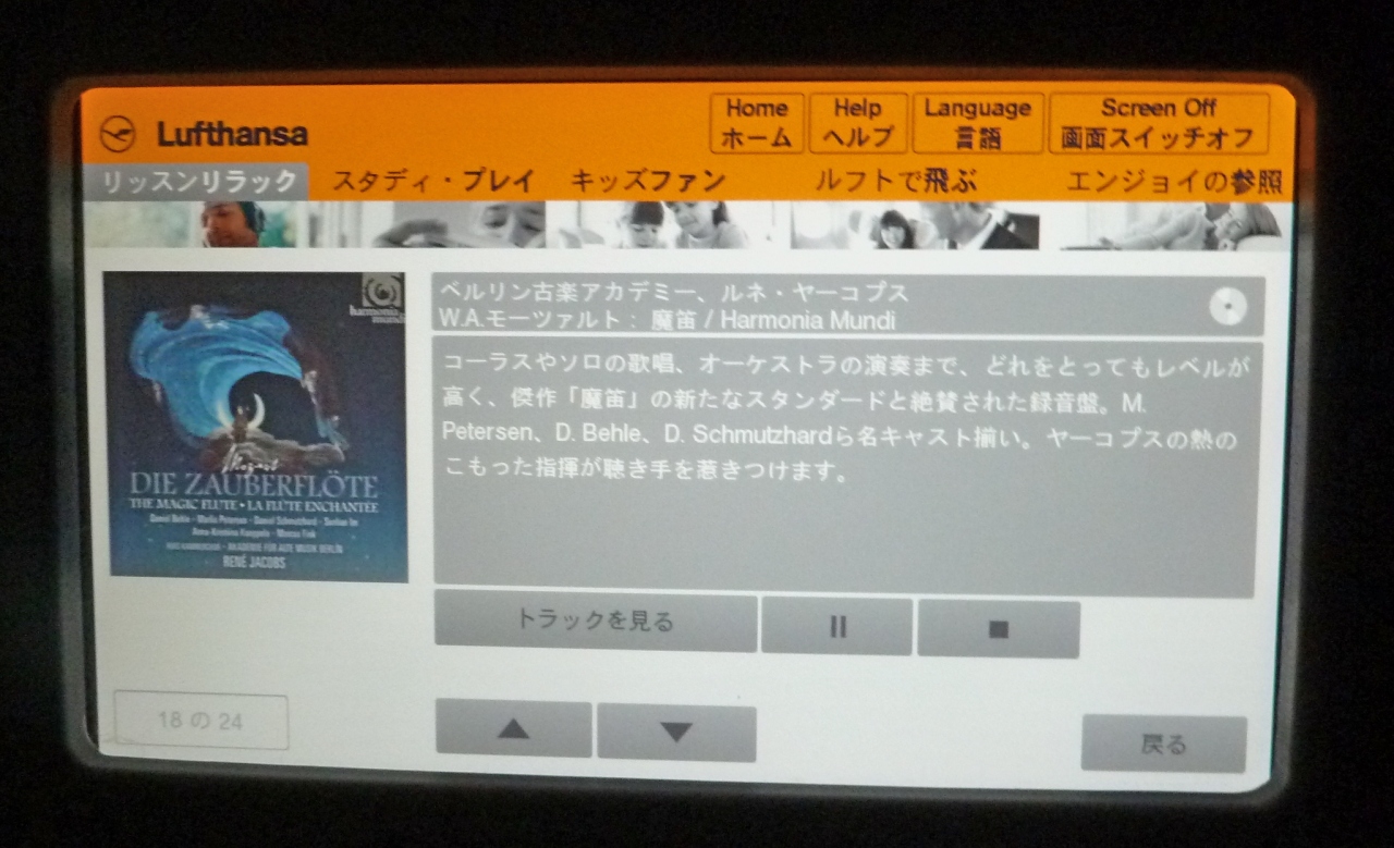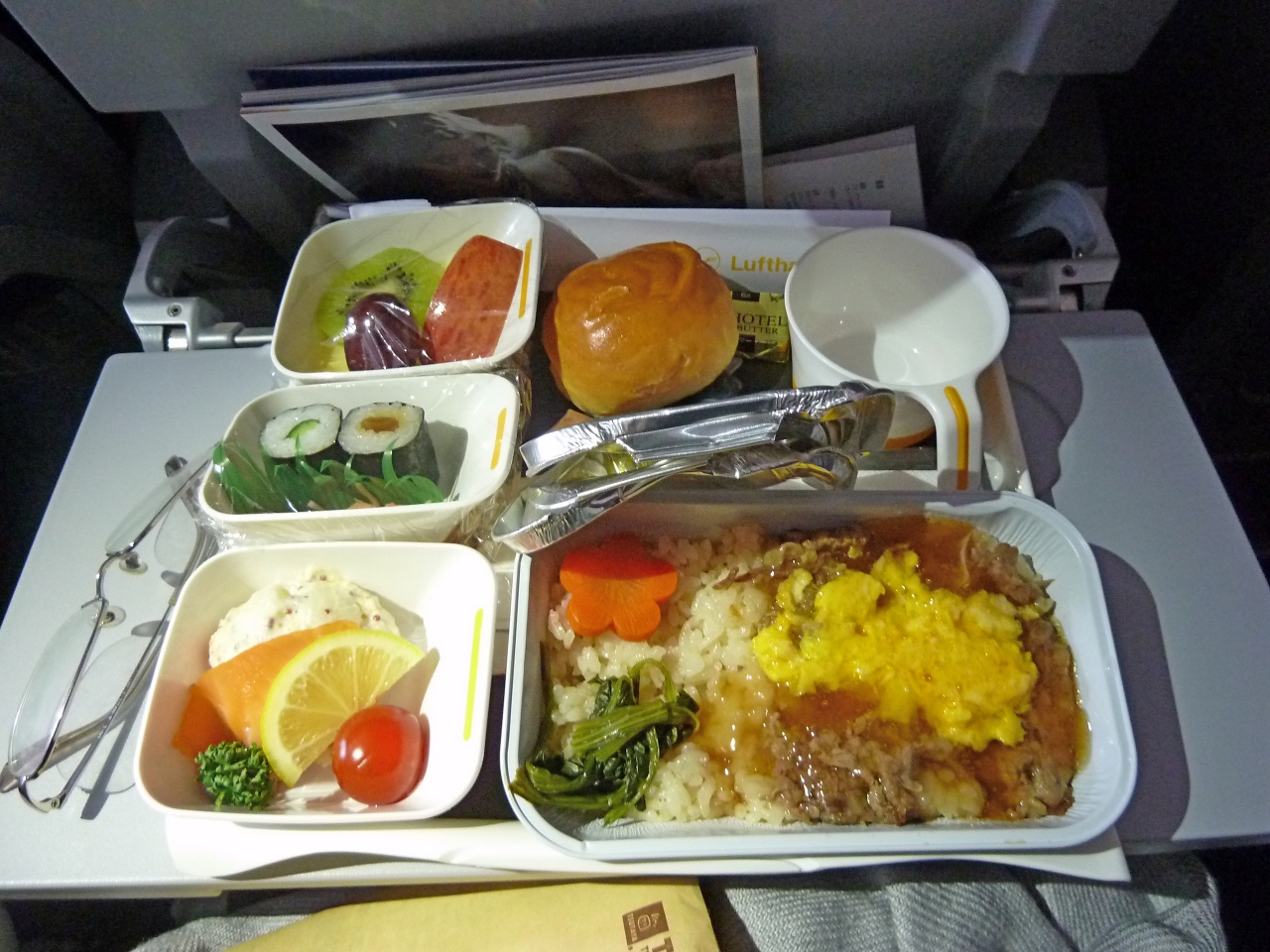 ルフトハンザのエコノミークラスの食事は選択はできるもののそれほどいい印象は持っていなかった.スイス航空,オーストリア航空,ANAのほうが良いと感じていた.しかし今回の柳川風牛丼は良かった.また2回目の食事もホットミールで感激!席はA380と新しい飛行機なので広いことを期待したが,たいしたことなかった.エンターテイメントシステムは映画が今ひとつ種類が少ない.音楽はクラシックを含め充実.フィンランド航空の2回目の食事のパンやSASの簡単な食事からくらべればとても良かった.A380は離陸するときの重量感が奇異な感覚だった.