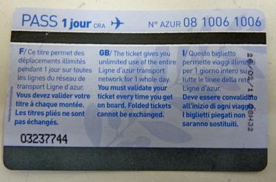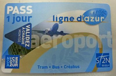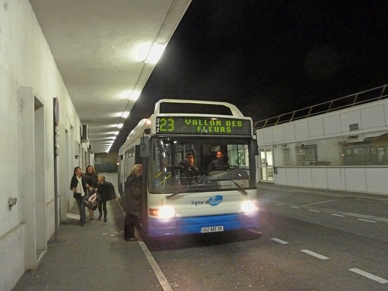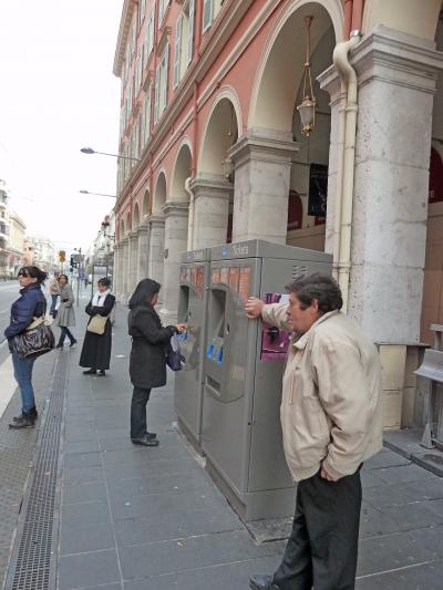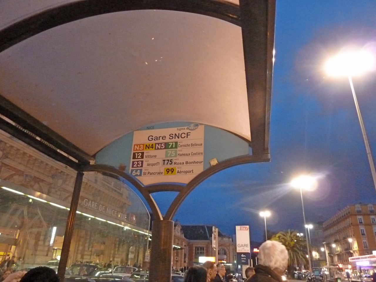 ニース空港から市内へのバス,バス98番は20分おきの.4ユーロだが,一日使えるパスでくれるので,それからは,トラムも含めて,乗車券を買う必要はない.普通のバスだと1ユーロ(23番).空港バスの方がメインロードPromenade des Anglais を市内まで直通するので速い.23番は帰りに利用したが,旧道を停まりながら空港へ.Nice Ville駅からは23番がメインのようだ.98番シャトルバスでアレベール1世公園前まで20分.23番で駅から空港まで30分弱.このバスも15-20分おきに出ている