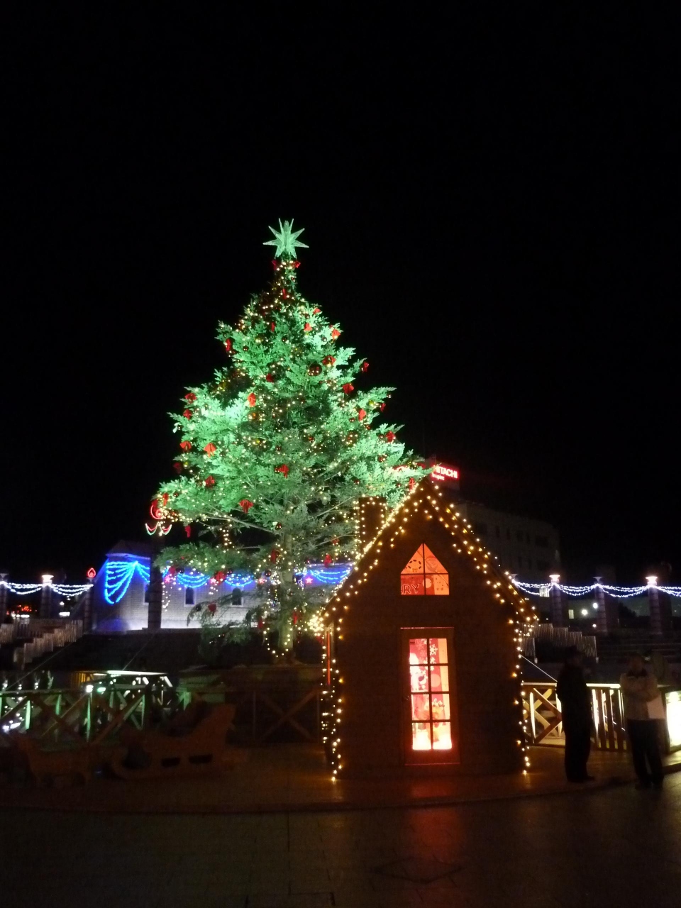 科学館前の新都市広場のクリスマスイルミネーション.光の数は少ないのだが,ツリーとサンタハウスがかわいい.ハウスの中ではサンタがスイング.なかなかこっていた.LEDの光の渦もいいが,小さくてもかわいいイルミネーションの方が子供には人気だろう