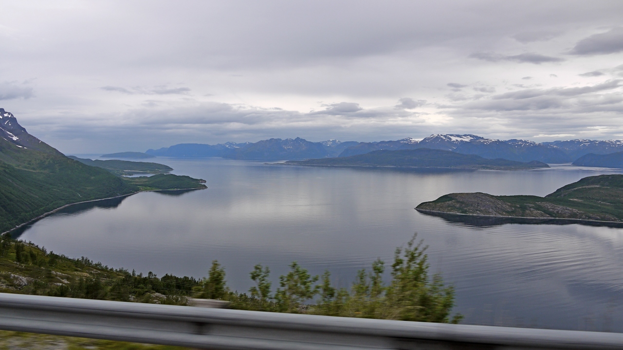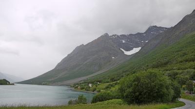 AltaからTromusoni向かって,Kveanangen自治体に入り,Kveanangsfindanの山々のふもと,Nordreisa自治体の間は絶景が望める.海からE6号線が急激に海抜402mまでのぼる.そこからみる氷河や山々が絶景だ.7月でも所々に雪が残っている.このあたりのドライブの絶好のビューポイント