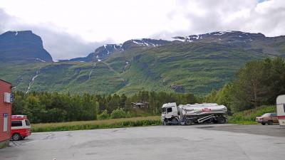 E8号線Kilpisjarvi(フィンランド側)とE6号線Altaからの道の合流する交通の要衝,Skibotnの西外れにある,ガソリンスタンドからの山の景色は絶景.ガソリンスタンドの裏庭が絶景の山々であるのがおもしろい.ここを車で通るのならぜひ立ち寄って景色を堪能して欲しい.