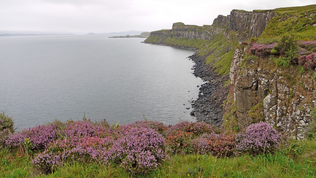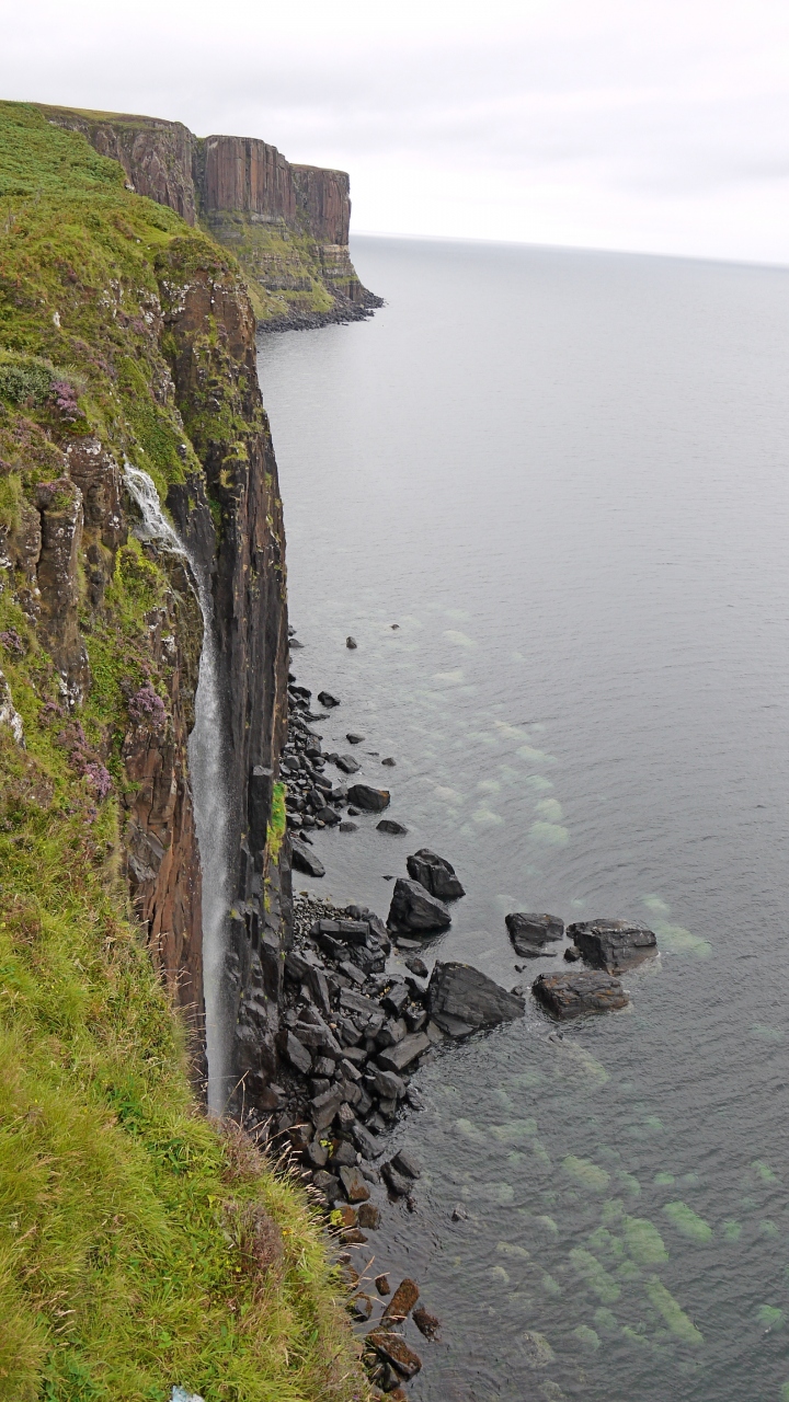 スカイ島の断崖の名所,Kilt Rock.湖からの小川が滝になり,滝が海に一直線に落ちていく.まわりは草原.すこしA855号線から駐車場が奥まっており,私は最初見過ごして通過してしまった.ここは必見の価値は確かにある.