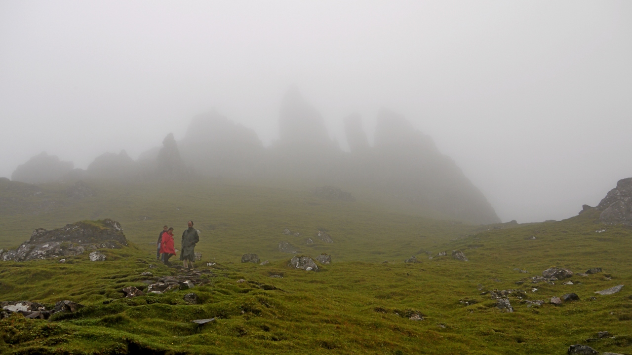 Old Man Of Storrは海岸から約700m登ったところにあり,当初1kmは木が茂った山道だが,その後は岩山(日本では2500-3000m級の)になる.私は霧がかかって,少ししかみられなかった.途中から引き返してしまう人も多い.私で往復90分.晴れていて景色が良ければ120分はみておく必要有り.山に登る覚悟必要.