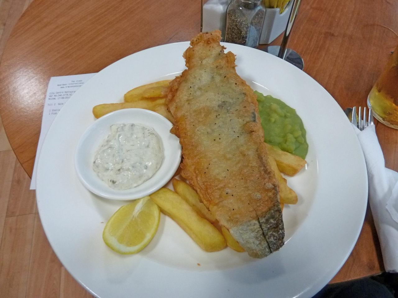 Aberdeen国際空港のカフェテリア The KichenでFish and chipsを食べたが,割とおいしかった.値段も手頃.ビールを飲みながら,ここで出発を待つのがいいかなと思う.