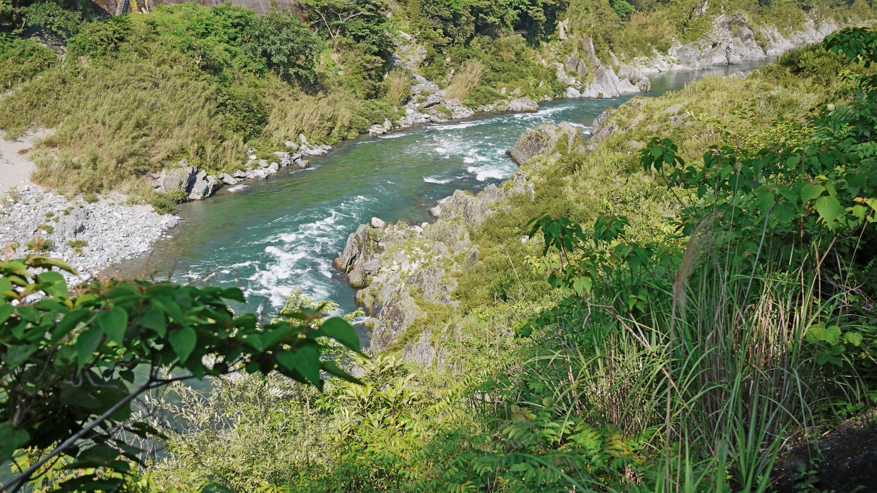 大歩危駅の,吉野川側ホーム3番線から小さな遊歩道があり,すこし大歩危峡が見える.列車の待ち合わせがあれば外に出て新鮮な空気と大歩危峡をのぞくとよい
