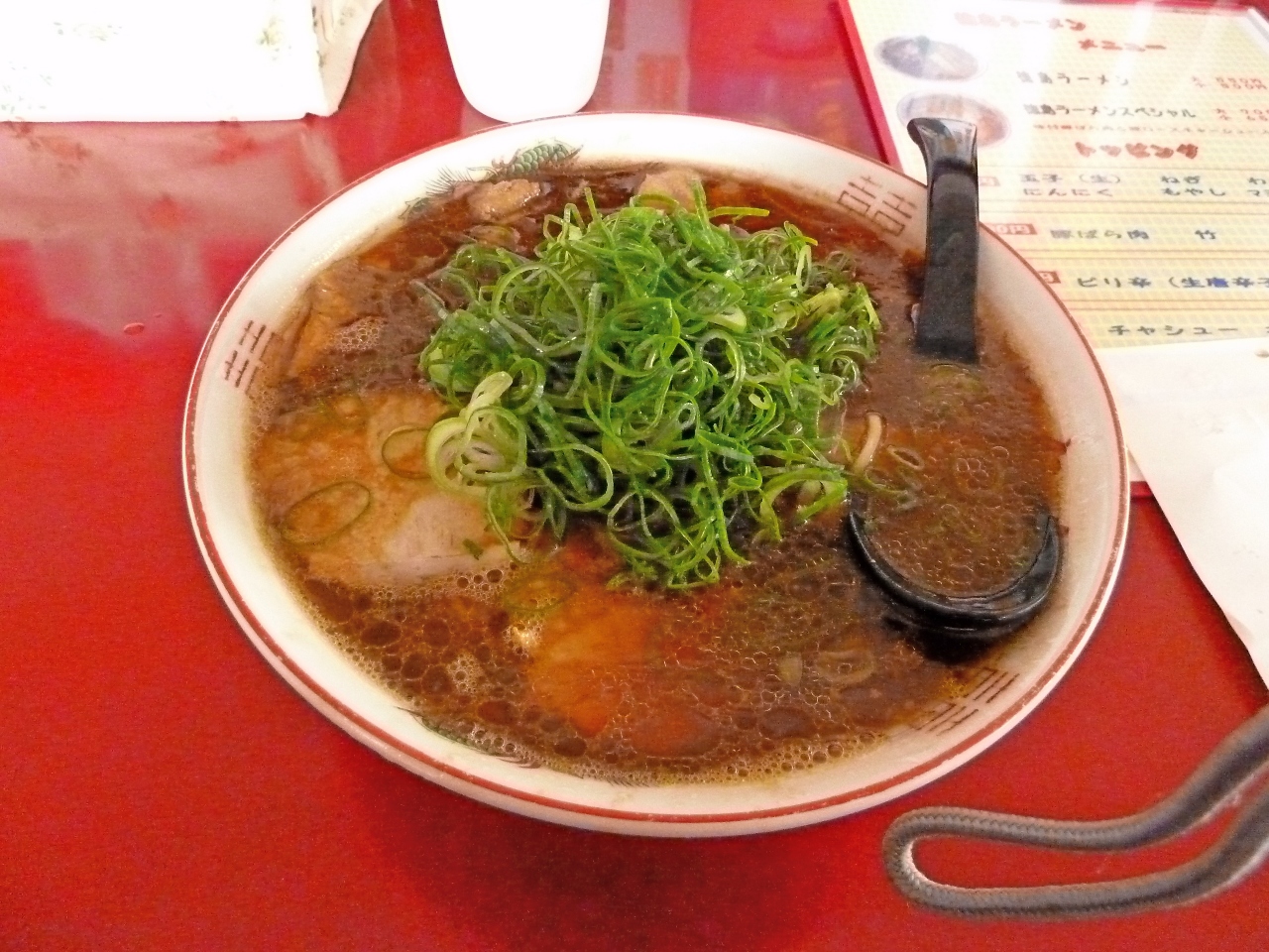 徳島ラーメンスペシャル大,トッピングにネギ.豚バラ肉やチャーシュ-がのっている.一寸濃いめ.まあ普通かな.特においしいラーメンとは思わなかった.