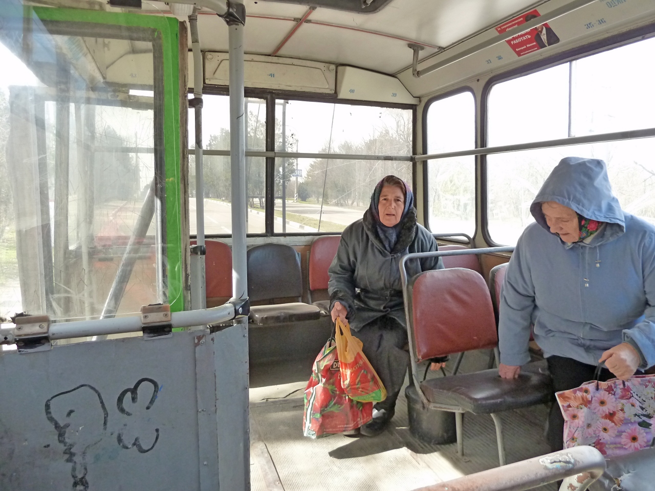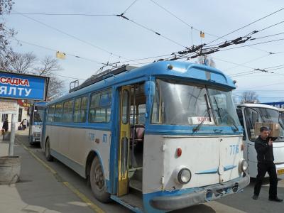 世界最長のトロリーバス,車体はソ連時代の年代物.途中4回も架線からパンタグラフが外れつつ,3時間かけてヤルタへ.12.18グリヴナ(140円)と激安.窓が汚れていて写真は撮りにくいが,庶民の表情がよくわかる.怖さは全く感じない.3時間で腰痛になるかと思ったが,耐えられた.トイレはないので注意!30分ごとなのでトイレしたくなったら途中下車でもよいと思う.クリミナの山地を越えていく,道路はソ連要人がヤルタに行くための道路なので非常に良い.詳細はhttp://4travel.jp/traveler/suomita/album/10447311/