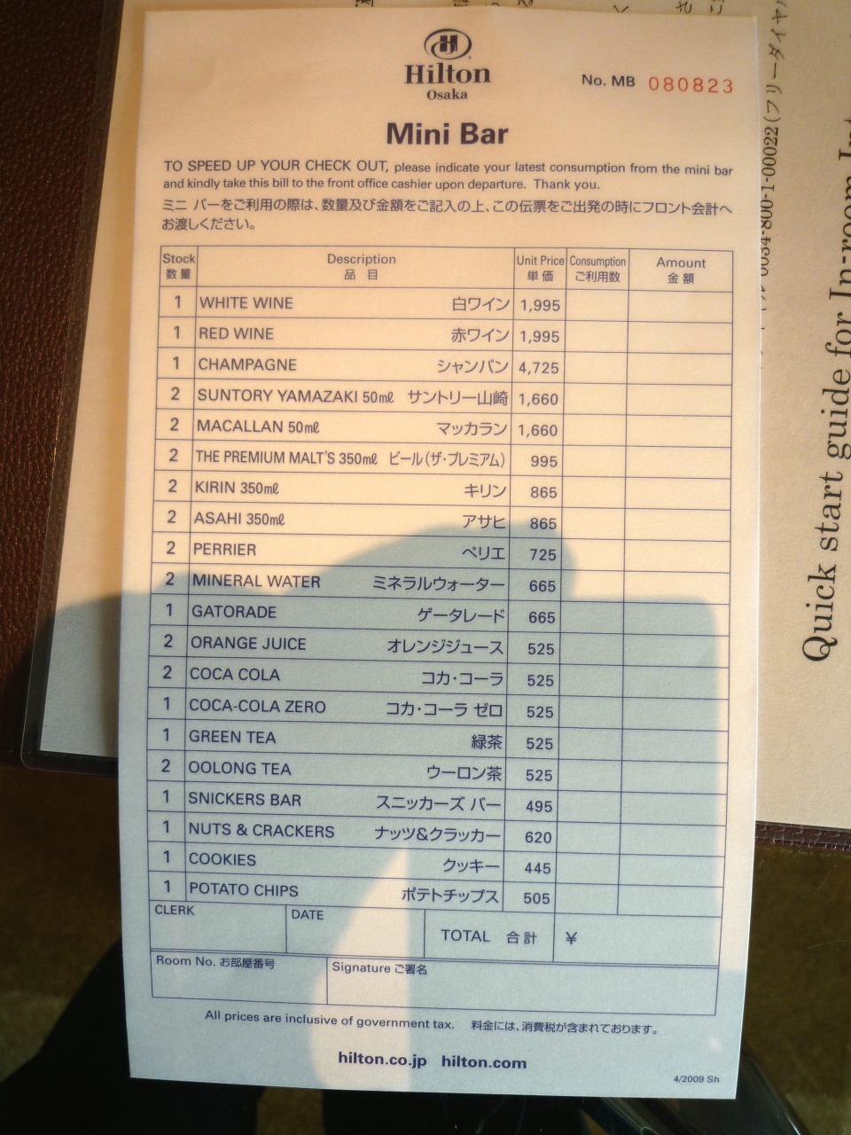 部屋の広さは標準,しっかりしたライティングデスクがあるのはうれしい. お風呂はこのクラスとしてはよくない.コペンハーゲンヒルトンのようにシャワールームと分離できているとよい.最低なのはミニバーの価格!このようなせこい儲け方はいまはほとんどのホテルはしない.ミニバーの価格を下げているのが現状だ.だれが525円のお茶を飲むものか!!世界一の物価がたかいところのコペンハーゲンヒルトンだってビール50DKK,800円だぞ!350mlで865円なんて,たぶん世界一の高さとおもう!物価の高い北欧の5つ星でもこんな価格は見たことはない!これではミニバーの意味がない!かつての悪名高いホテルニュージャパンの商法を見るようだった!ホテルの良識が問われる!!朝の食事はオムレツを焼いてくれるのはうれしいが,他は5つ星標準,わたしはコストベネフィット比からいえば他のホテルを薦める.