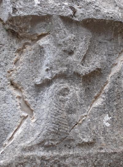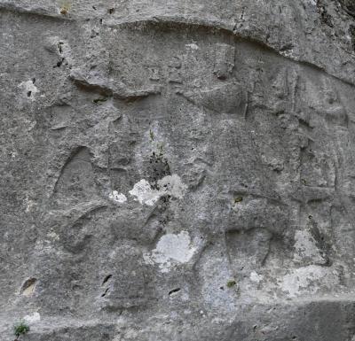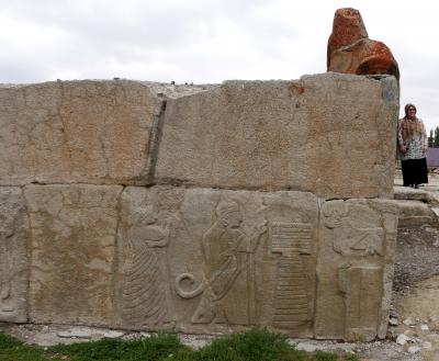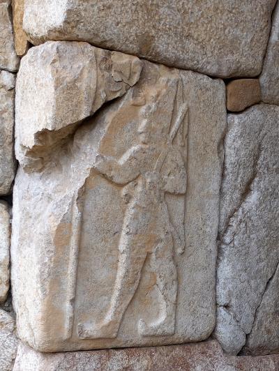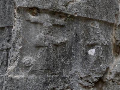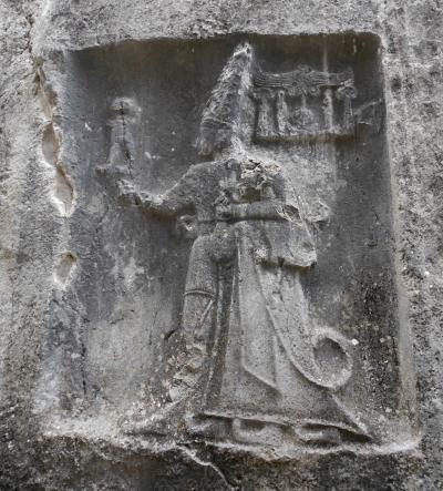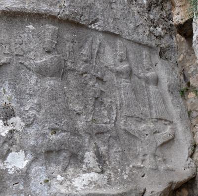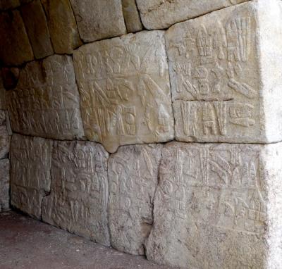 紀元前13世紀のレリーフ 謎の国ヒッタイトの国王を祀る場所.すばらしい神々のレリーフ.有名な冥土の十二神のみでなく,嵐の神,アリンナの太陽の女神,冥土の神ネルガル,そして嵐の神の息子サルマなど,その多神教の世界が広がる もうただただ息をのんだ これが3200年余りの時を超えて,野外に残っているなんて!もう言葉がない.ここまで来たかいがあったしかしこの神々の世界の向こうにヒッタイトの物語が悠久の時をかさねているのだ.Hattusha最後の王,シュピルリウマ2世が父トゥタルヤ4世を祀るために作った紀元前13世紀の露天神殿 岩に刻まれたレリーフに神々の様子が描かれる.