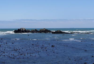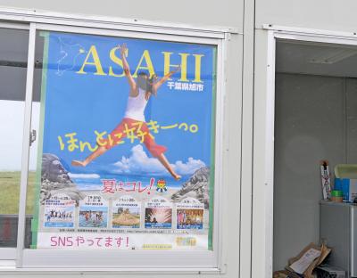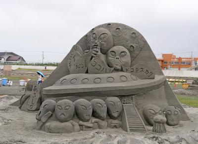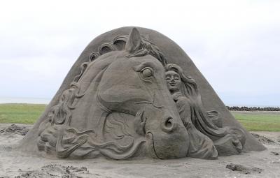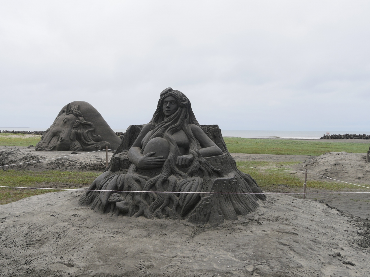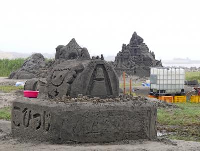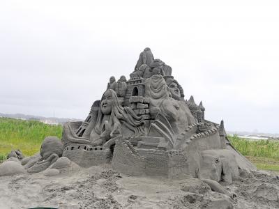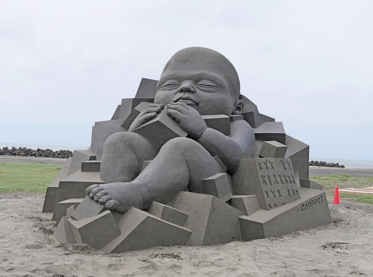 この海岸で7月に行うあさひ砂の彫刻美術展 前衛的な作品が多いが近くに来たら見るとよい