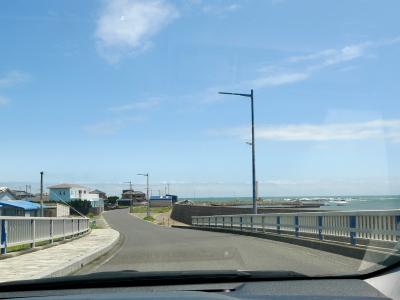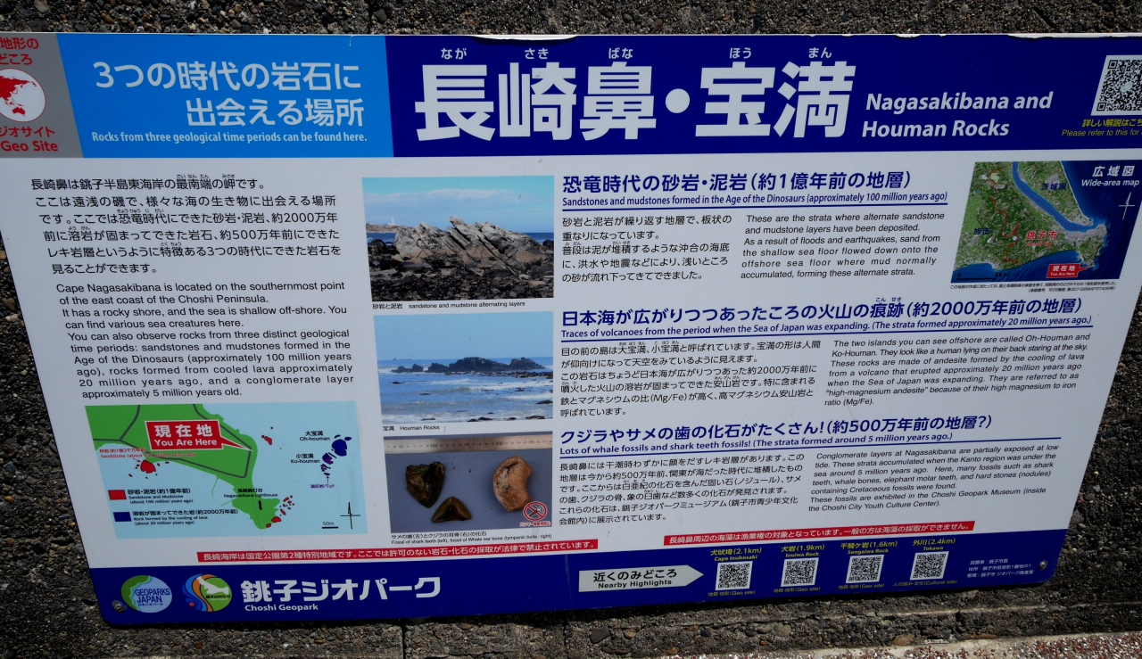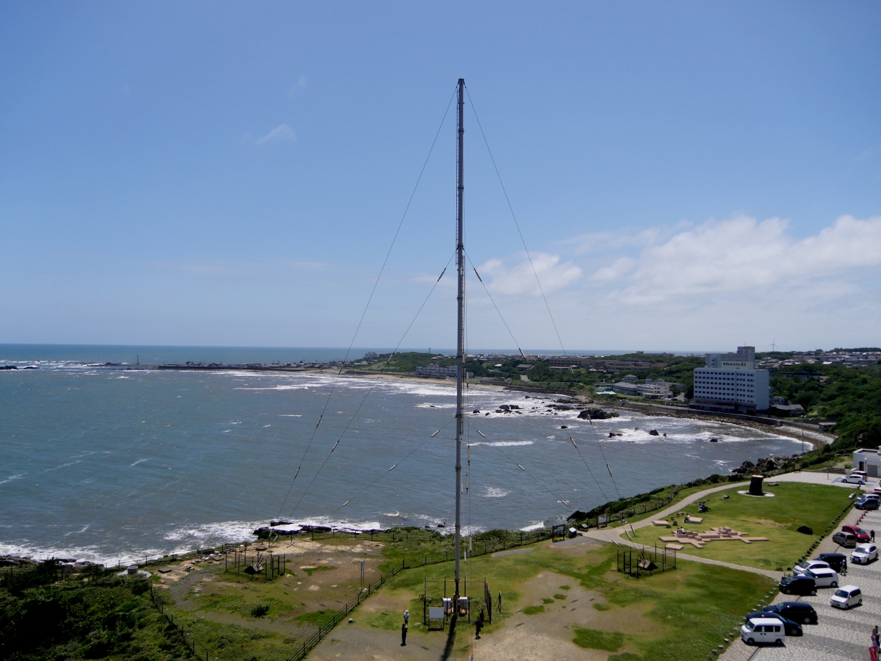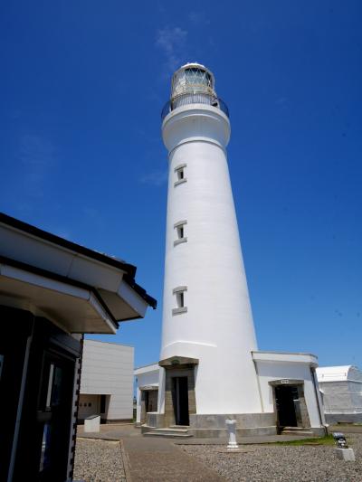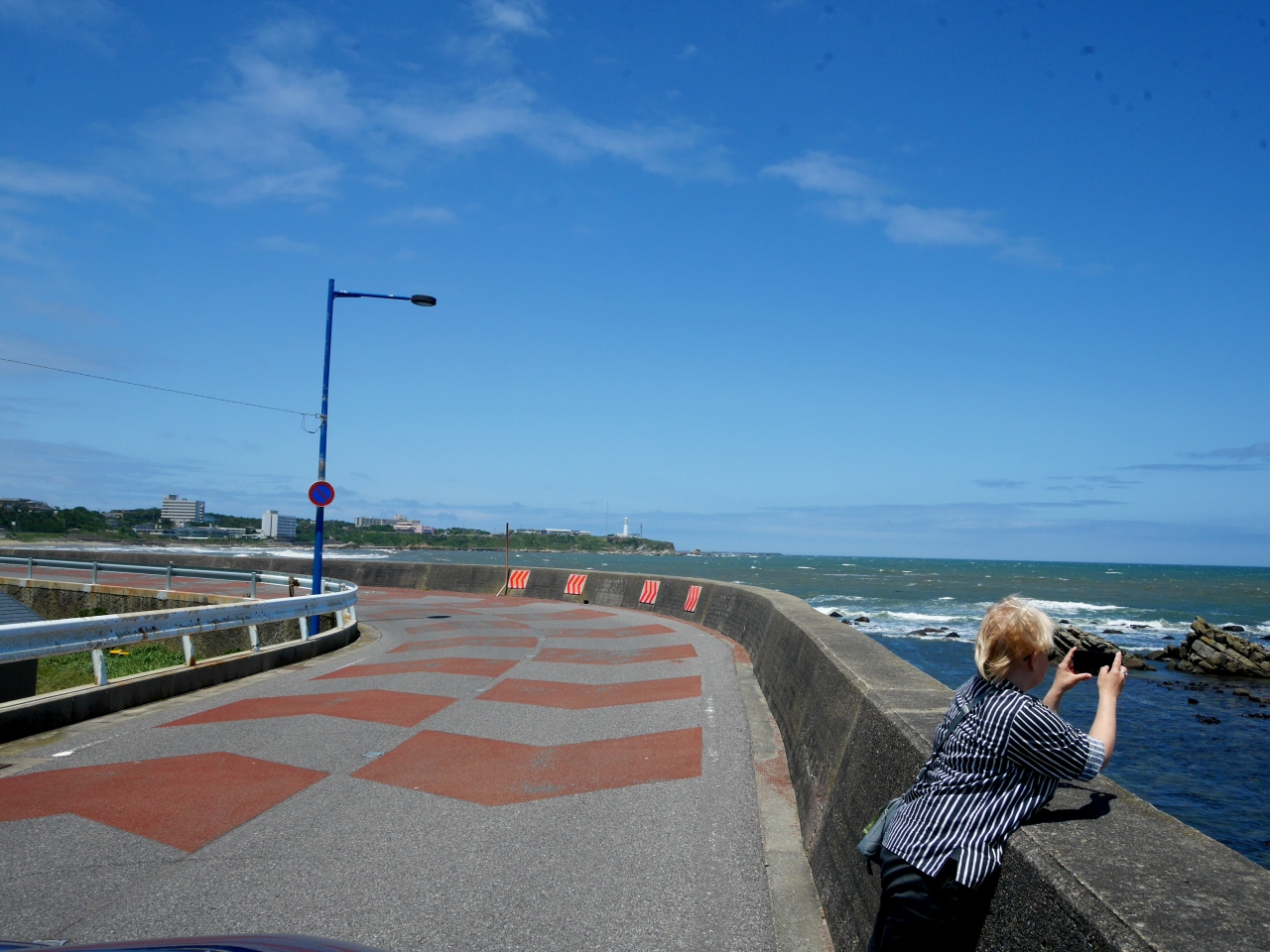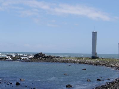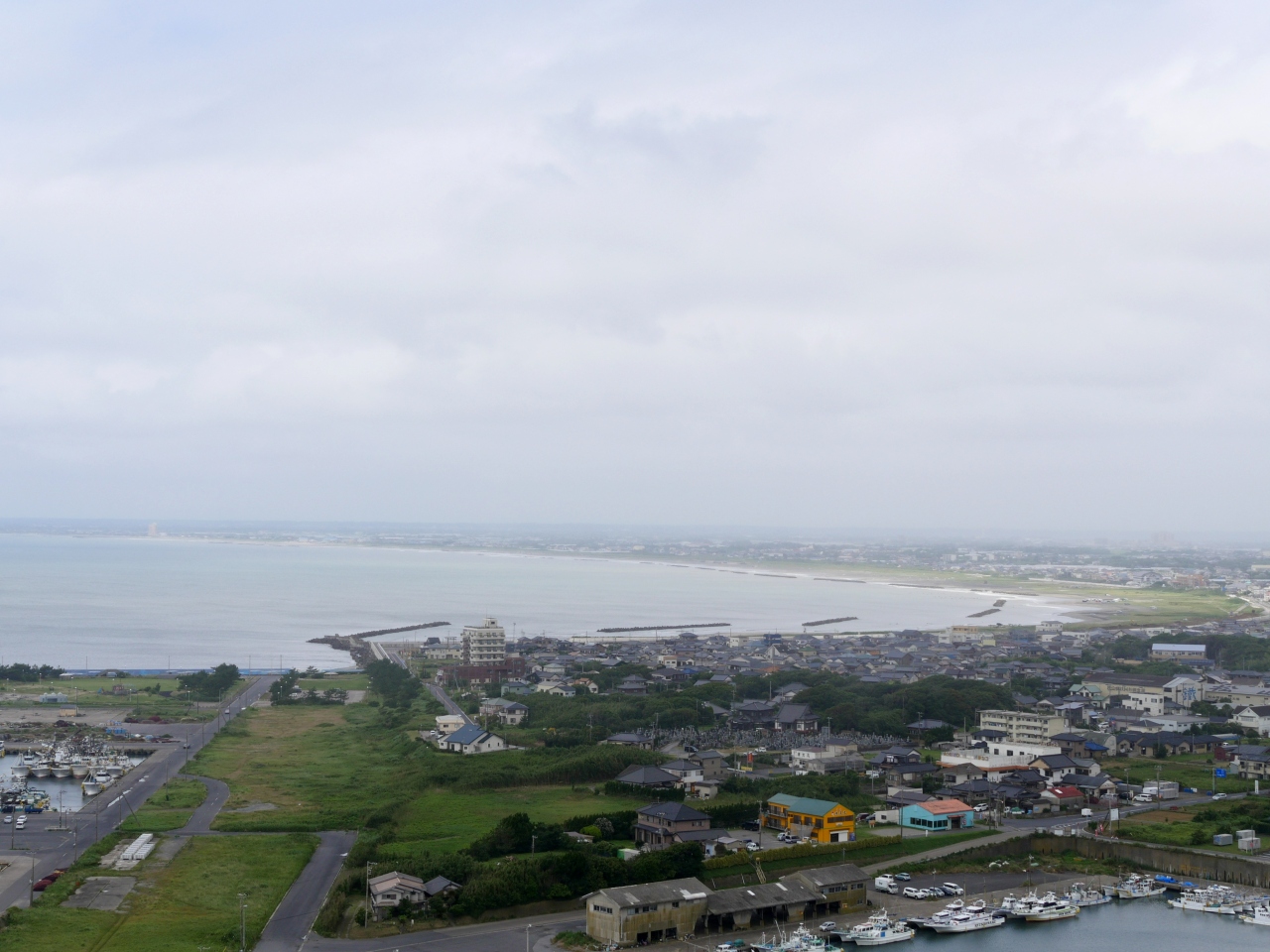 ここから銚子の古い地質に代わる そのため屏風ヶ浦の一番端になっている高台だ.飯岡刑部岬展望館~光と風に登る.九十九里の長い浜がよく見える.周りに風力発電も多い.刑部岬灯台は白亜のかわいい灯台だ.高さはわかるのだが,当然のことながら周りの崖のすごさはわからない