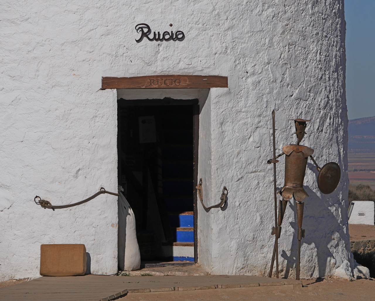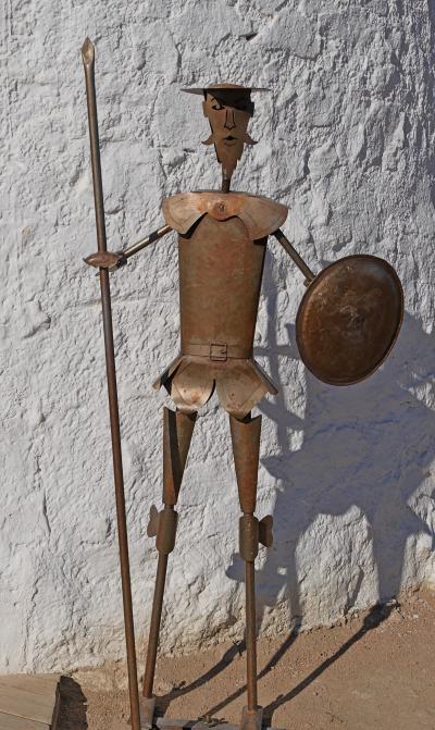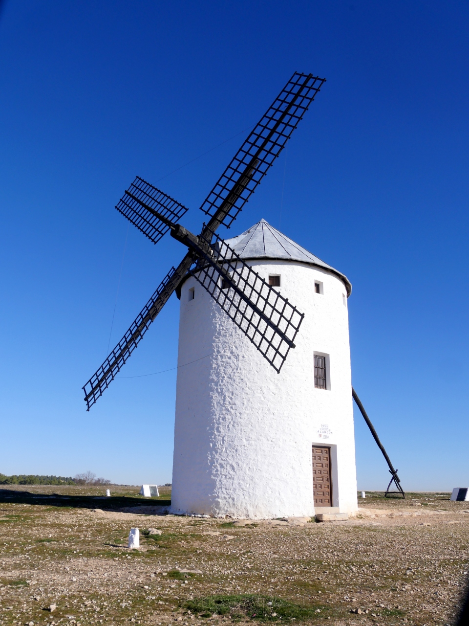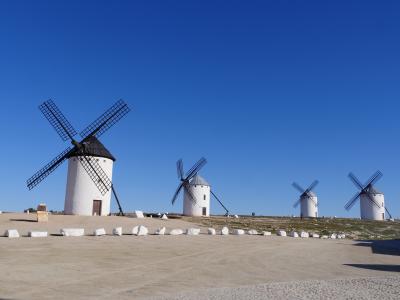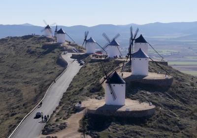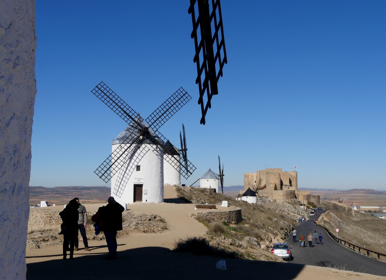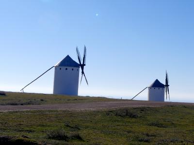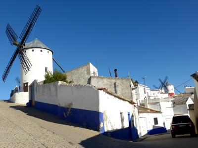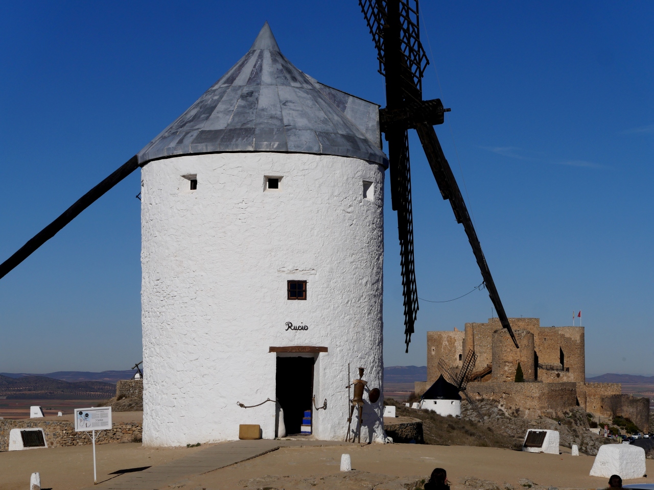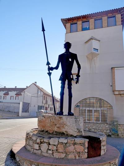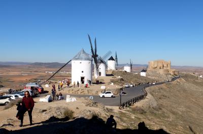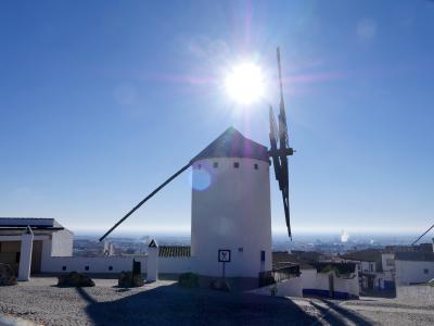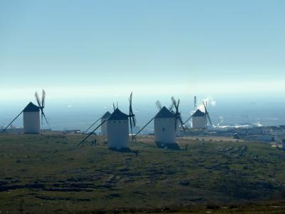 ドンキホーテで有名な風車は街のはずれの丘の上にある,レンタカー町中から上がるには若干複雑なのでナビに任せるとよい.街の東はずれから上っていく.そのついでにスペイン広場(といっても交差点だ.Isaac Peral通りとAntonio Espin通りとの交差点)にドンキホーテ像があるので見ていくといい,風車群は高台にあり,確かに巨人を髣髴とさせる.街と共存する風車もあるのですべて歩き回るとよい