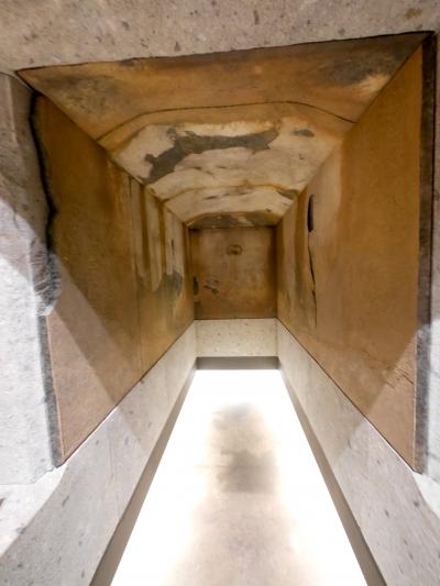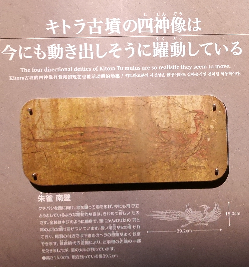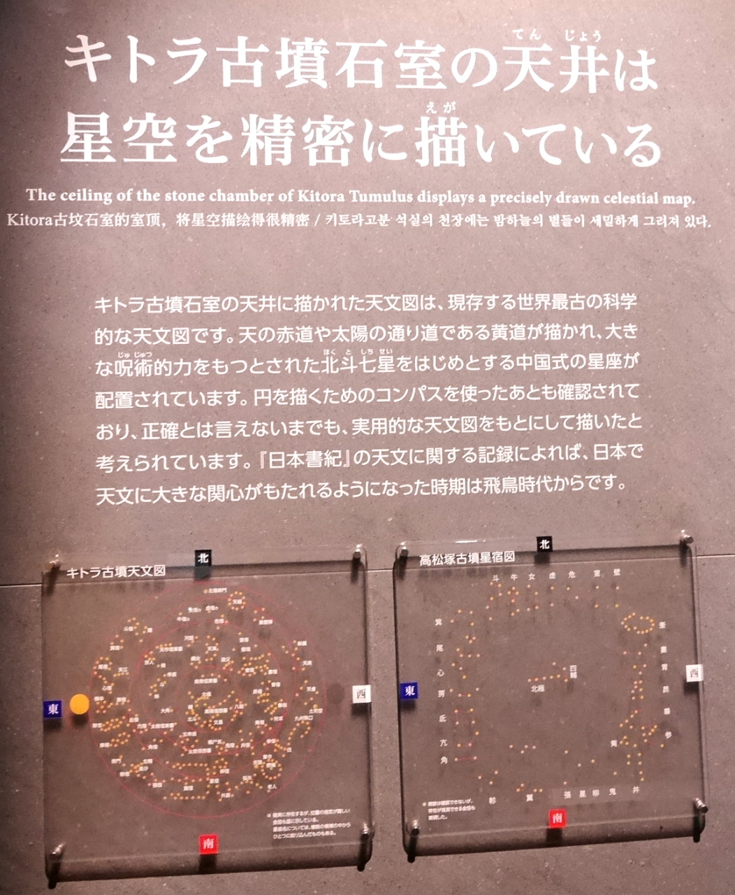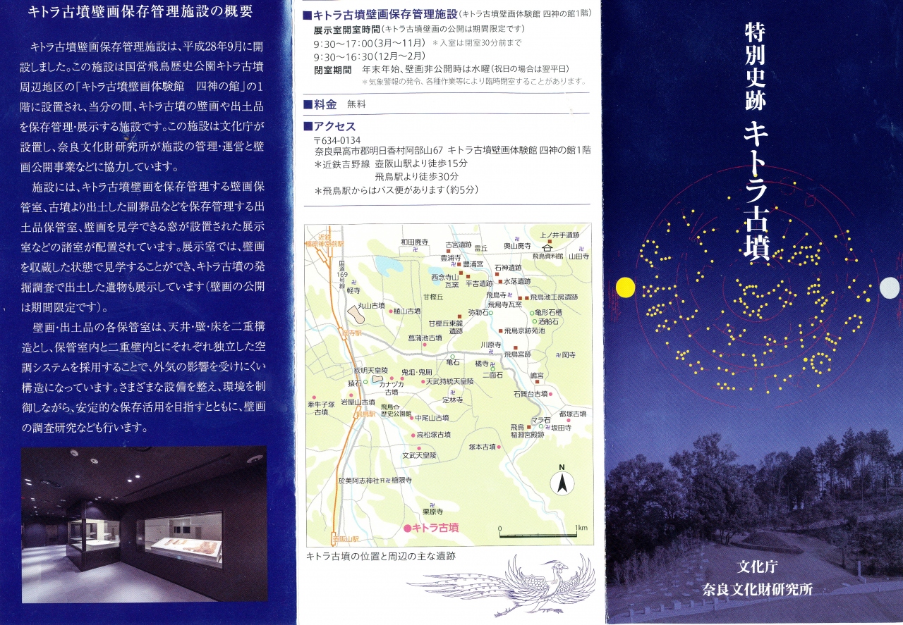 まずキトラ古墳壁画体験館 四神の館に.1階は保存施設 ガラス越しに保存の様子を見学することができる.地階は展示室.この展示室はキトラ古墳のすばらしさを上手に展示していた.パンフ類も充実している.充実した展示のわりに無料がうれしい