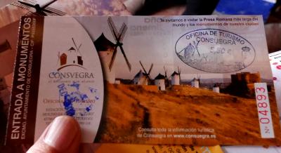 どうしてもみたかったのはドンキホーテのラマンチャの風車だ.彼が愛馬ロシナンテにまたがり巨人ブレアレオと間違えて,突進したのは明日行くCampo de Criptanaだが,このConsuegraの丘の上の12基の風車は,真ん中のConsuegra城(Medieval城)の南北に散らばり,すばらしい景観を作っている.眼下には,Consuegraの街と広がるラマンチャの大地 ため息が出るほど素晴らしい.最初の風車Boleroに観光案内所 風車のみの入場料2.5ユーロ 城と市立博物館の共通券5.5ユーロだった.10番目のRucioも中が見学できるのとおみやげ屋 風車の小さな置物と,スマホ立てを買ったがこのスマホ立て,評判が良かった.近くに来るなら街の雰囲気もいいのでおすすめ