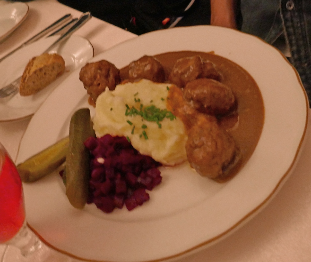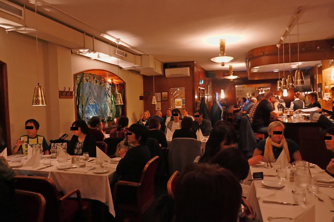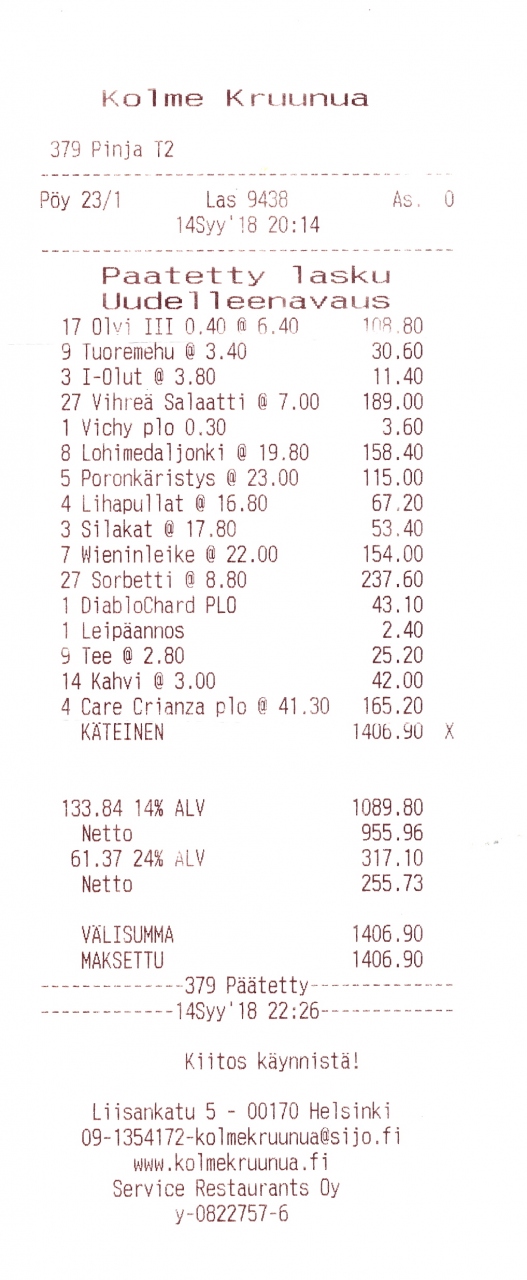 予算の関係上,サラダ,メイン,デザートにドリンク1杯,コーヒーか紅茶のつもりだったが,皆からねだられ,ワインを5本も取ってしまった まあしかたない この店はカジュアルで,フィンランドの伝統料理をアレンジした店で,割とおいしいし,高くないので好きな店だ しめて1406.9ユーロ 一人あたり52.1ユーロ 6774円だった 飲んだのでまあそんなものだろう.ウィーン風シニッツェル 22ユーロ ミートボール 16.8ユーロ 鮭のmedaljonkiという料理 19.8ユーロなどがおすすめ 赤Care Crianza 1本 41.3ユーロ 白 DiabloChard 43.1 ユーロ