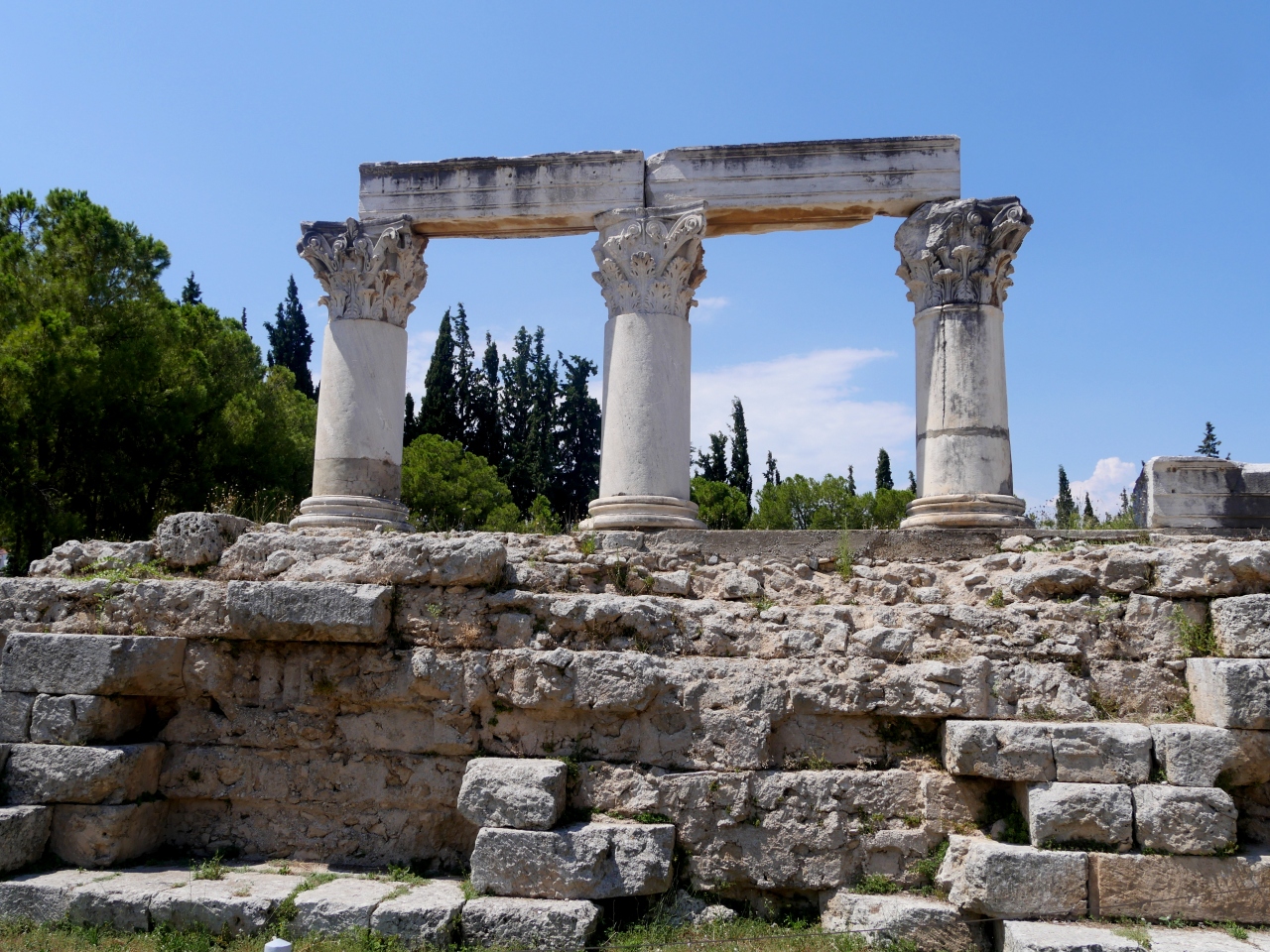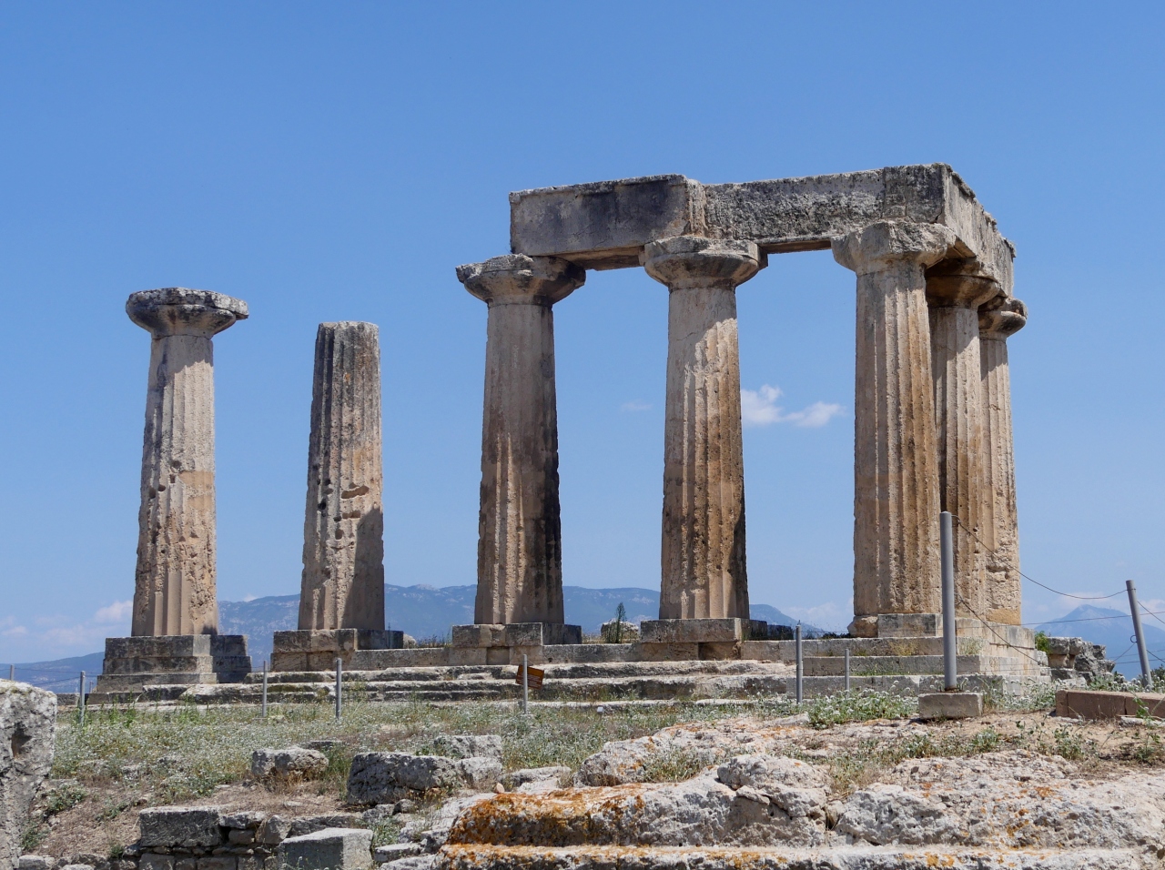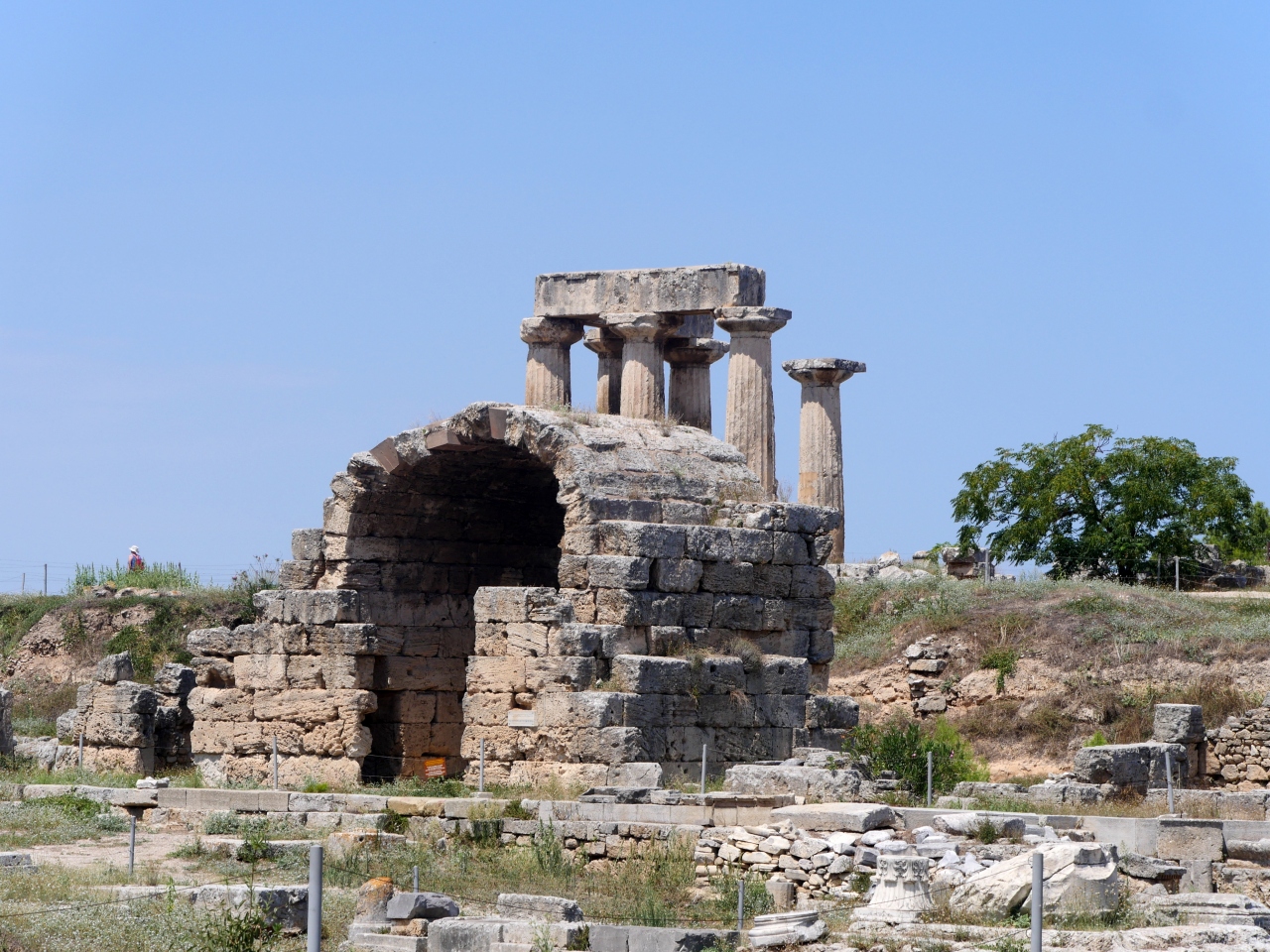 博物館にはコリントス式の陶器がすばらしい.一部撮影禁止の場所があったのが惜しい 小遺跡ではここだけだった.デルフィも,オリンピアも,ミケーネもOKだった.遺跡はなんといってもアポロン神殿がランドマーク.しかし私は3本の柱が残るオクタビアヌスの神殿の方が印象的だった.真夏の遺跡めぐりは暑い暑い!暑さの中でローマ時代の音楽堂に行くのを忘れてしまった.暑さ対策は必携だ!入場料8ユーロ 全体には,あまり建物は残っていなく,オリンピアやデルフィを見るのならここはパスしてもいいかなと思う