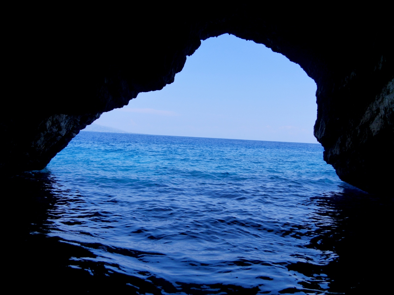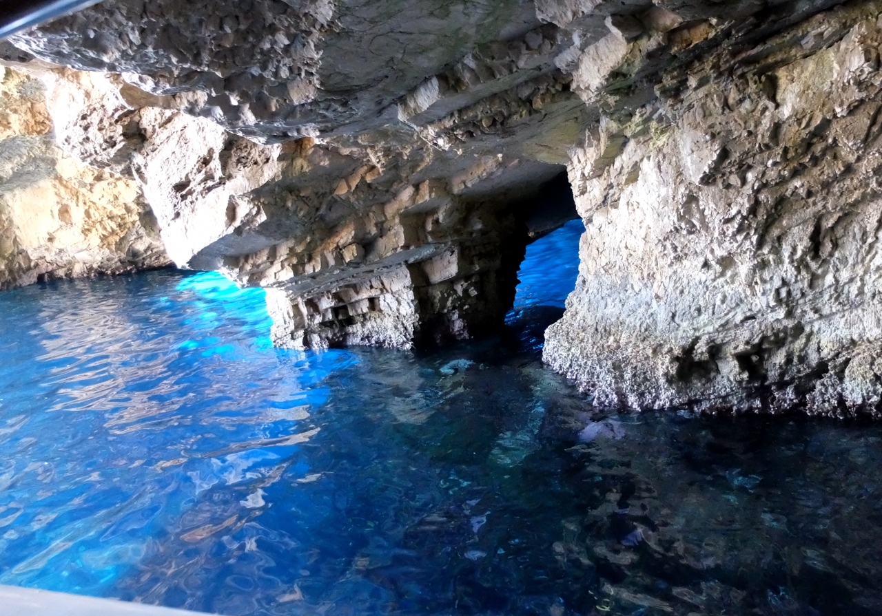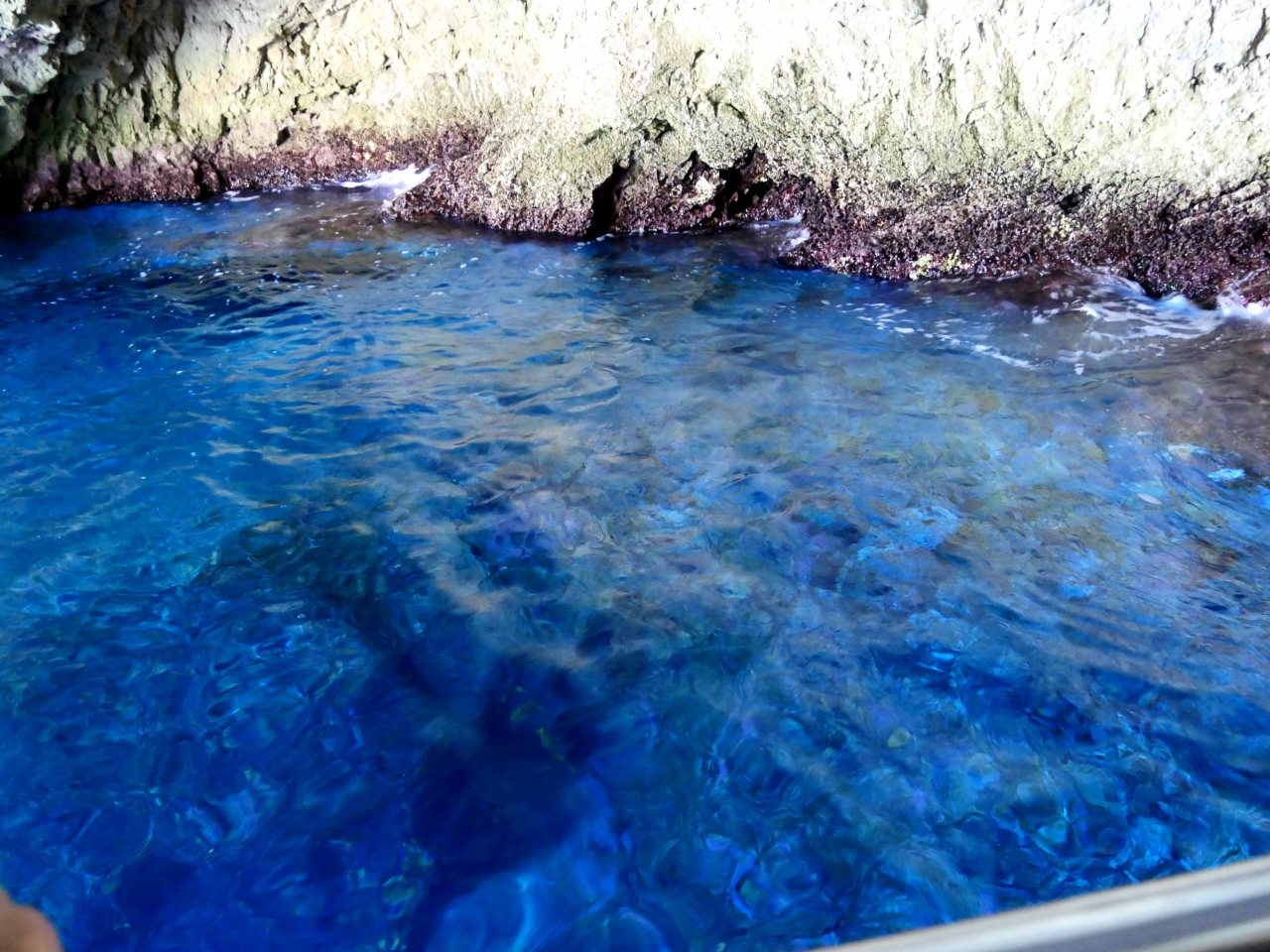 .青の洞窟とシップレックビーチとのセットで20ユーロ 1310 まず青の洞窟に行く小型のボートに乗る.最初の洞窟が青の洞窟だったが,むしろここは複数の洞窟があり,青の洞窟群と行ったほうが適切だろう.水色から濃い藍色,そしてエメラルドグリーンまで光の度合いでいろいろな色に出会えた!ため息が出るほど.1350 乗り場に帰る 4分程度の泳ぐ時間付き(私たちは泳がなかったが)正味40分 素晴らしいボートだった!時間はもっと欲しかったと思う.青い洞窟は下に白い大理石があり,短波長でエネルギーの大きい青系の光は,減衰率が低く拡散光となって遠くまで届くからということ.そして大理石に反射しては光るということらしい.空の青いのと同じ理屈との事