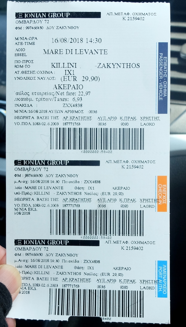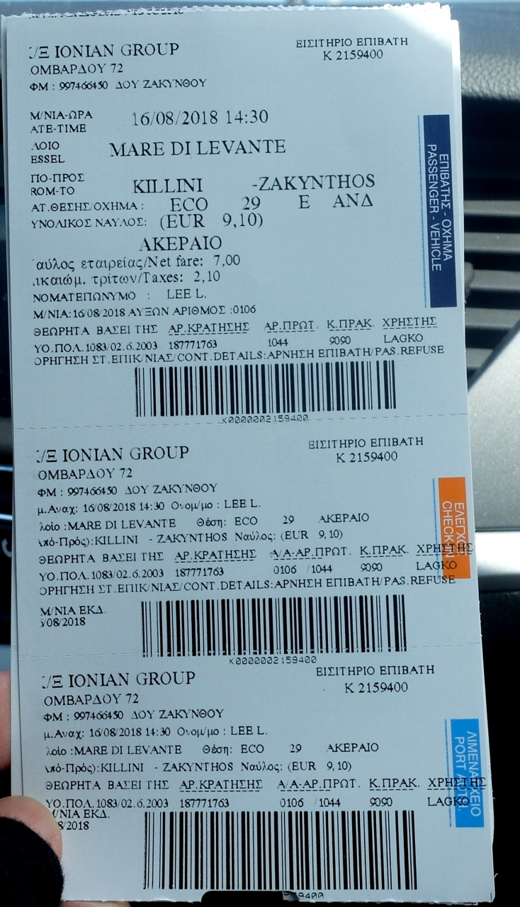 Levante Ferries これが乗船券 ここは車1人(ドライバー1人付き)という従来のシステムと違う